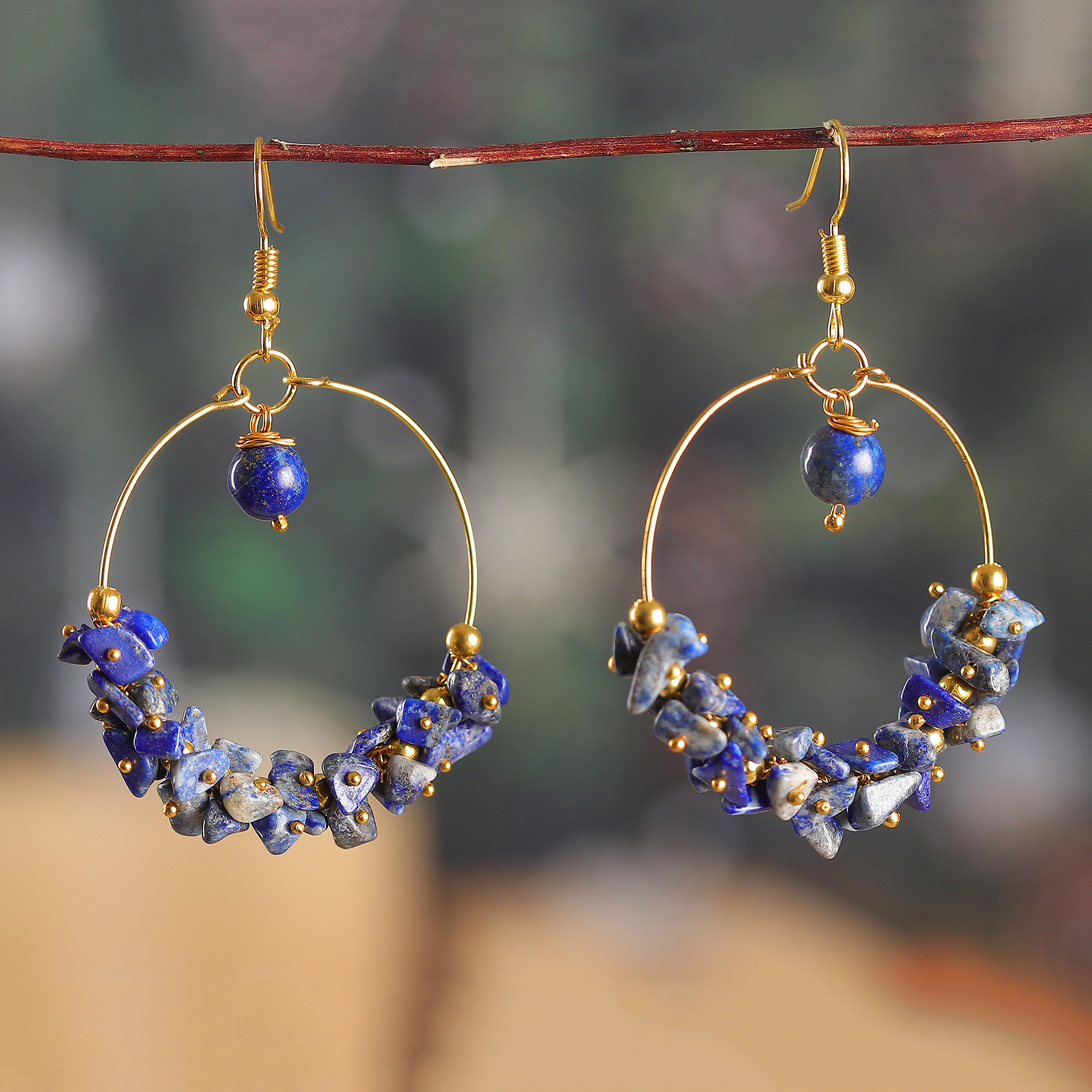 Turn heads with these regal lapis lazuli statement earrings by Indian designer Swasti Jain. Bent electrophoretic-coated iron wires create a chandelier-style framework that supports and showcases the stones' sublime blue hue, forming an elegant spectacle that balances modernity with feminine appeal.
