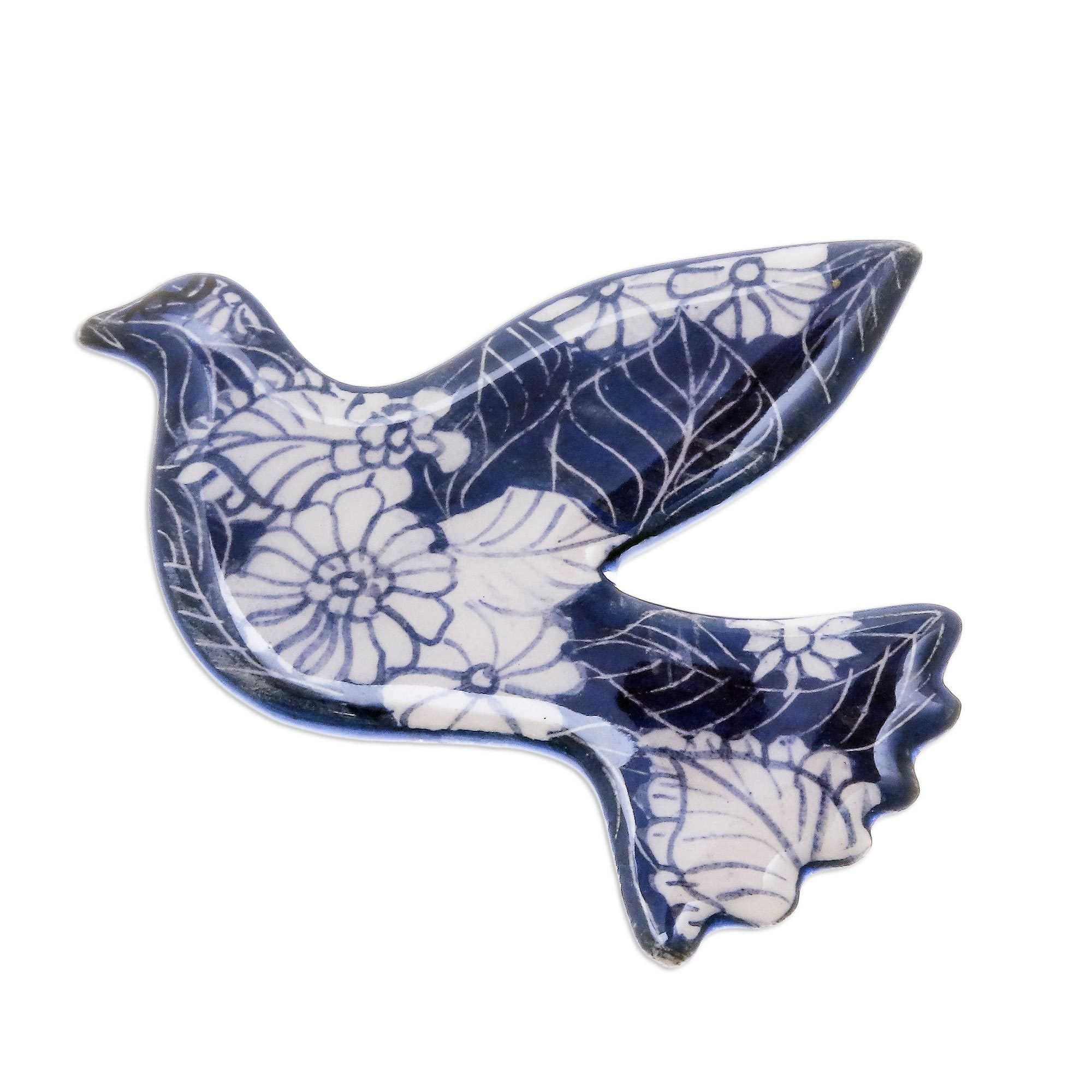 Blue Floral Ceramic Dove Brooch from Thailand, 'Midnight Dove'