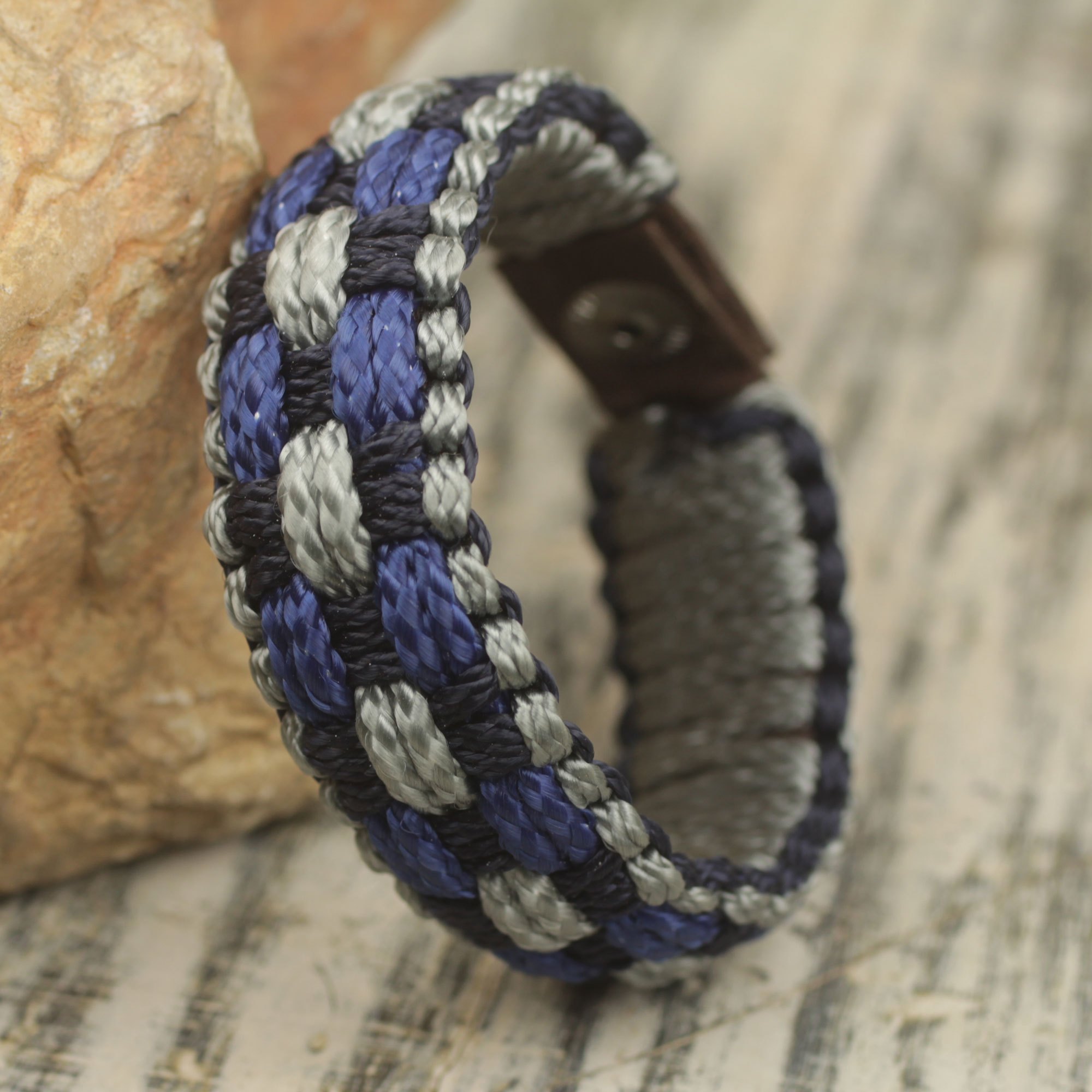 Ghana's Robert Aidoo-Taylor crafts a colorful wristband bracelet for men, hand-woven from sturdy polypropylene cords. The gray, navy blue and black bracelet closes with a brass snap.