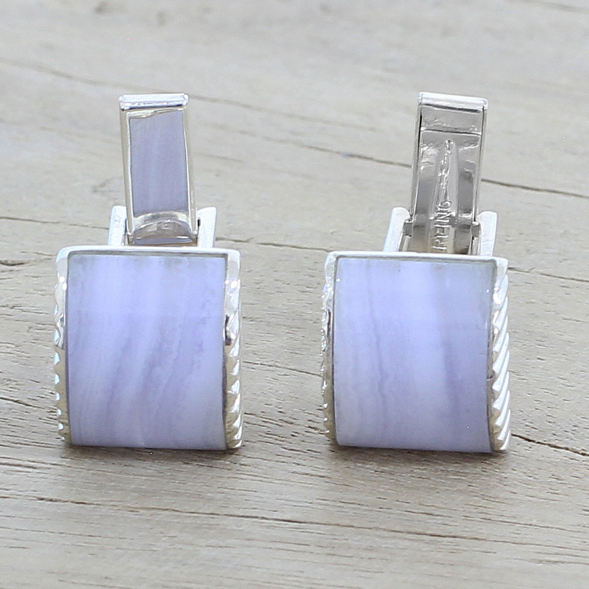 Blue lace agate is showcased in a pair of handcrafted cufflinks from India. Designed by Shubhra Singh, they frame each sleek gemstone with sterling silver wave motifs.