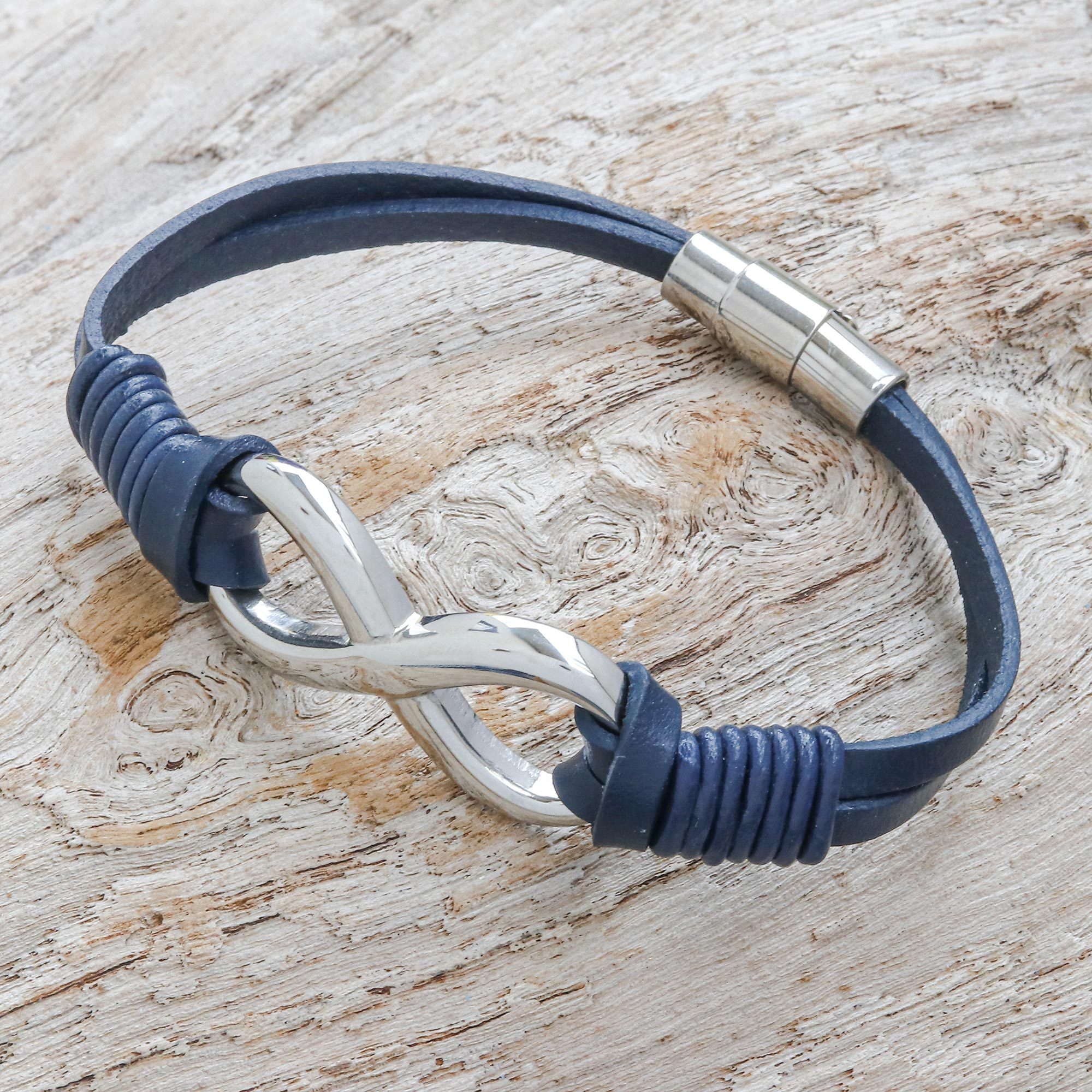 Blue Leather Unisex Pendant Bracelet, 'Cool Infinity in Blue'