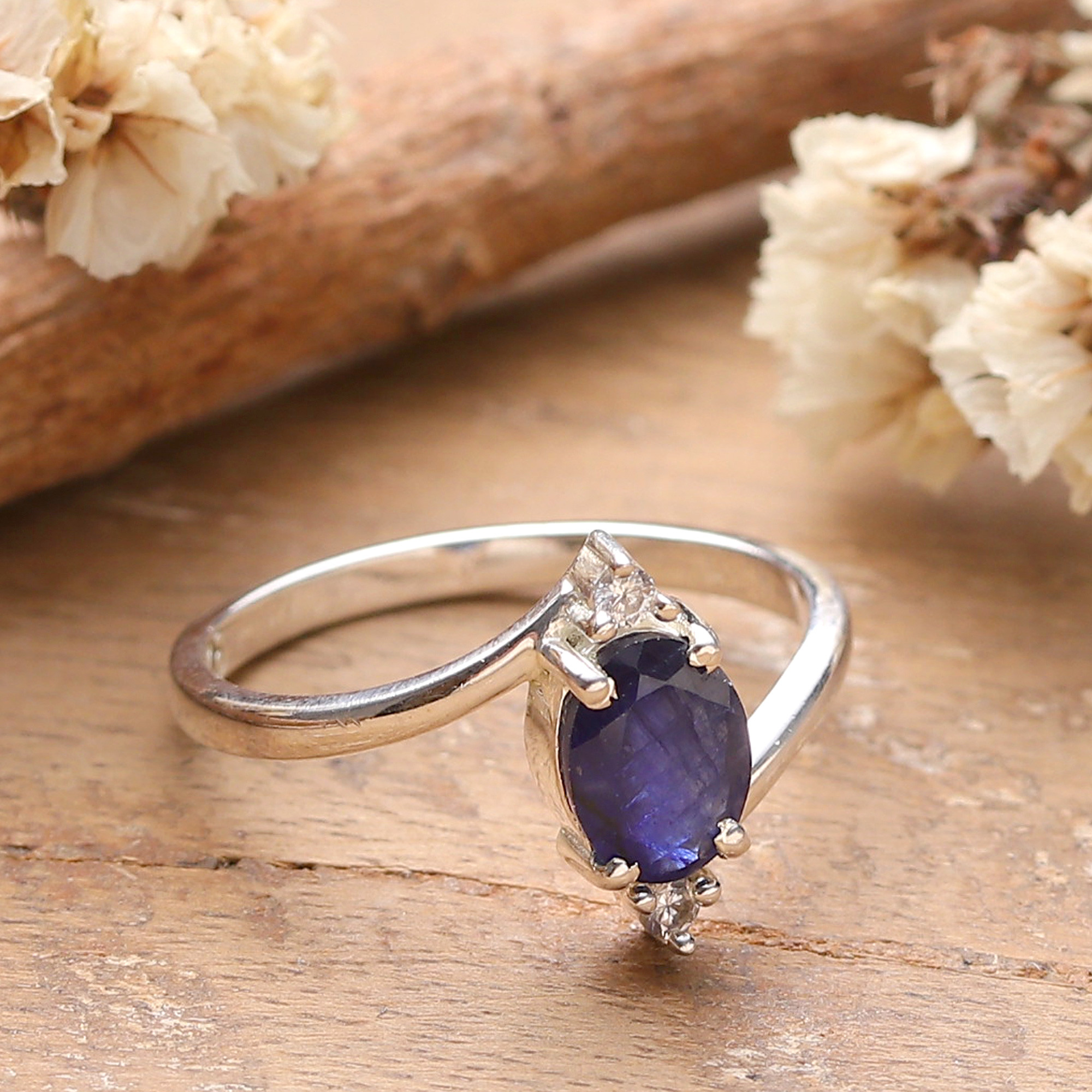 Perfect for special occasions or as a treasured everyday accessory, this elegant sterling silver cocktail ring is adorned with a striking sapphire as its centerpiece. The oval gem exudes a deep, captivating midnight blue hue that symbolizes wisdom and elegance. It is securely held in a refined prong setting, allowing the stone to catch the light beautifully. The design is enhanced with subtle accents of sparkling cubic zirconia on the sides, adding a touch of brilliance without overshadowing the sapphire. A timeless piece, this ring presented by India's Chintan blends classic charm with modern sophistication.