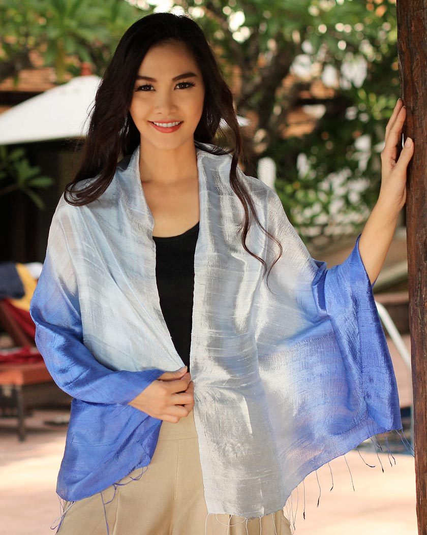 Shimmering shades of royal and light blue distinguish this shawl with original elegance. From Vinita, the shawl is hand-woven with raw silk, dyed by hand.