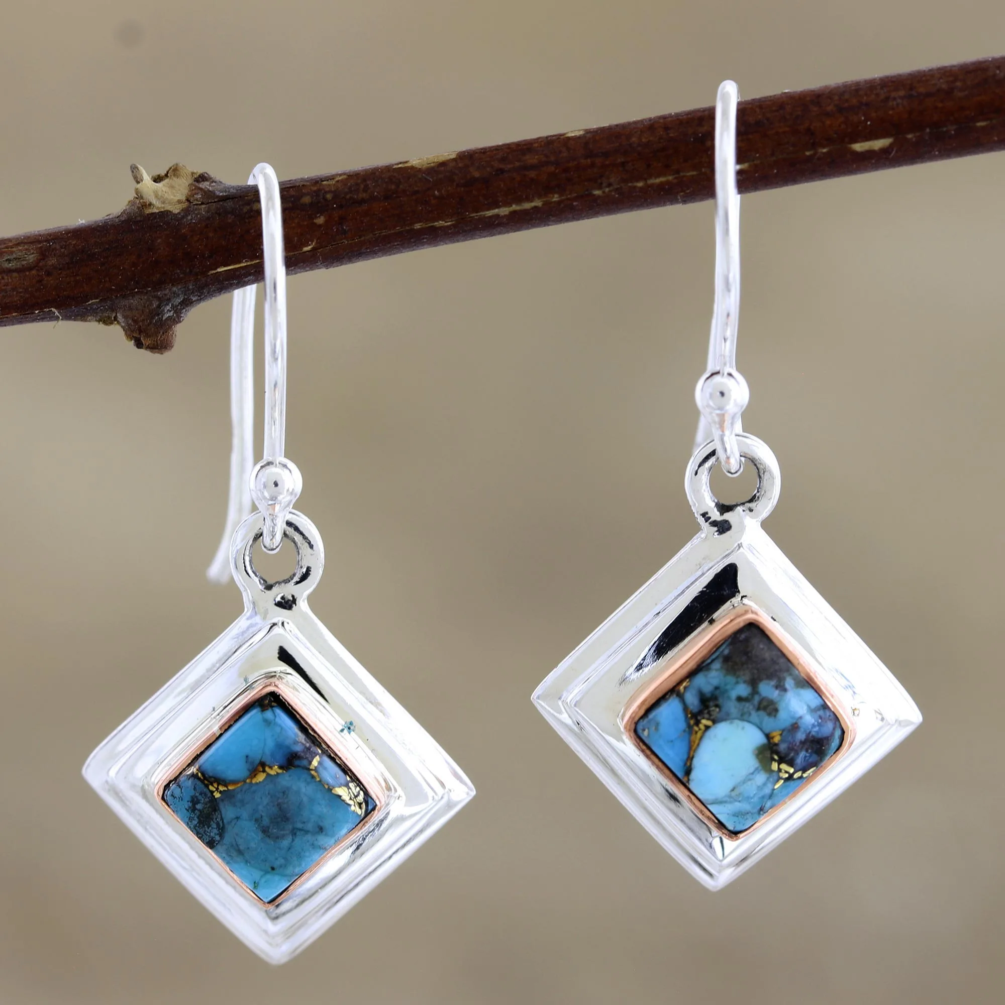 Let twinkling gemstones and cool silver give your ears a colorful upgrade. Presented by Neeru Goel and crafted by Indian artisans, the pair feature a blue reconstituted turquoise gemstone framed with a thin copper wire and gleaming sterling silver.