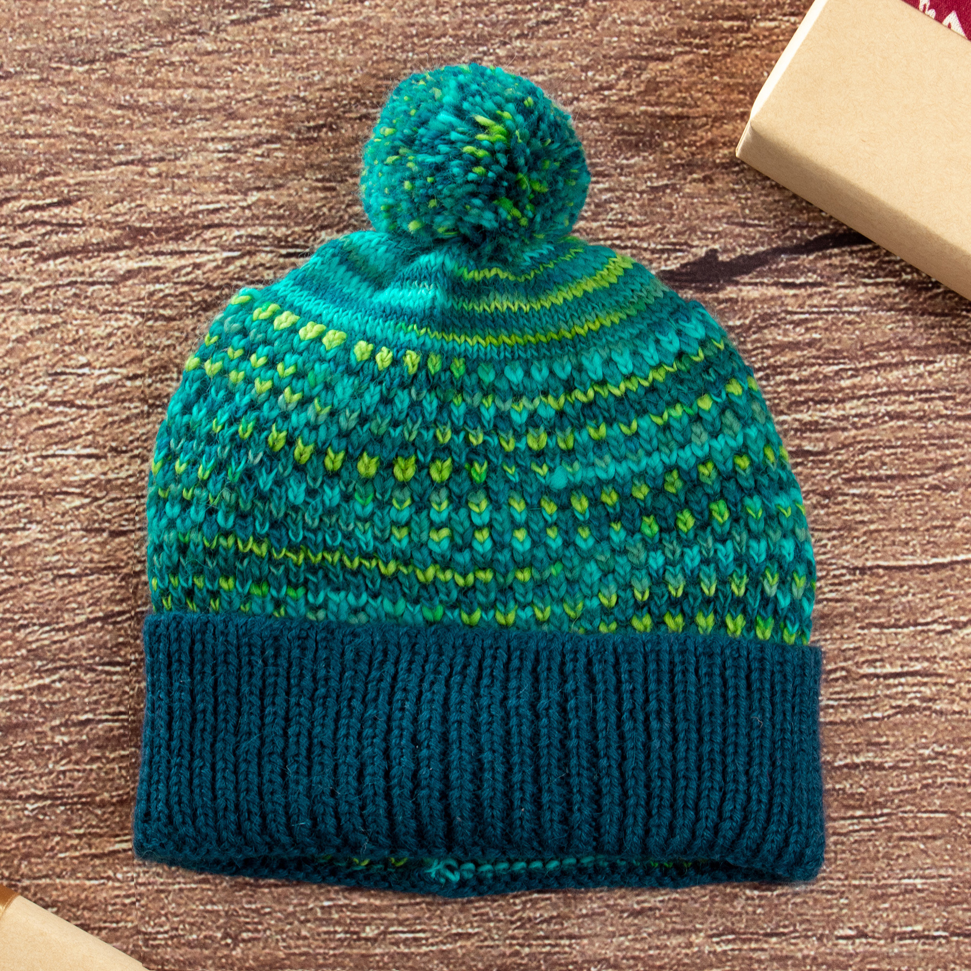 Blue Teal Green Patterned Knit Alpaca Blend Hat with Pompom, 'Pretty in Blue'