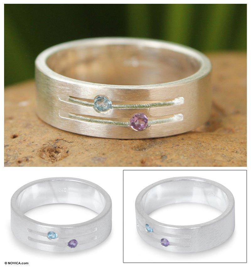 This delightful ring by Thailand's Jantana is thoroughly contemporary. Exalting the textures of brushed silver, it hosts an amethyst and a sparkling blue topaz.