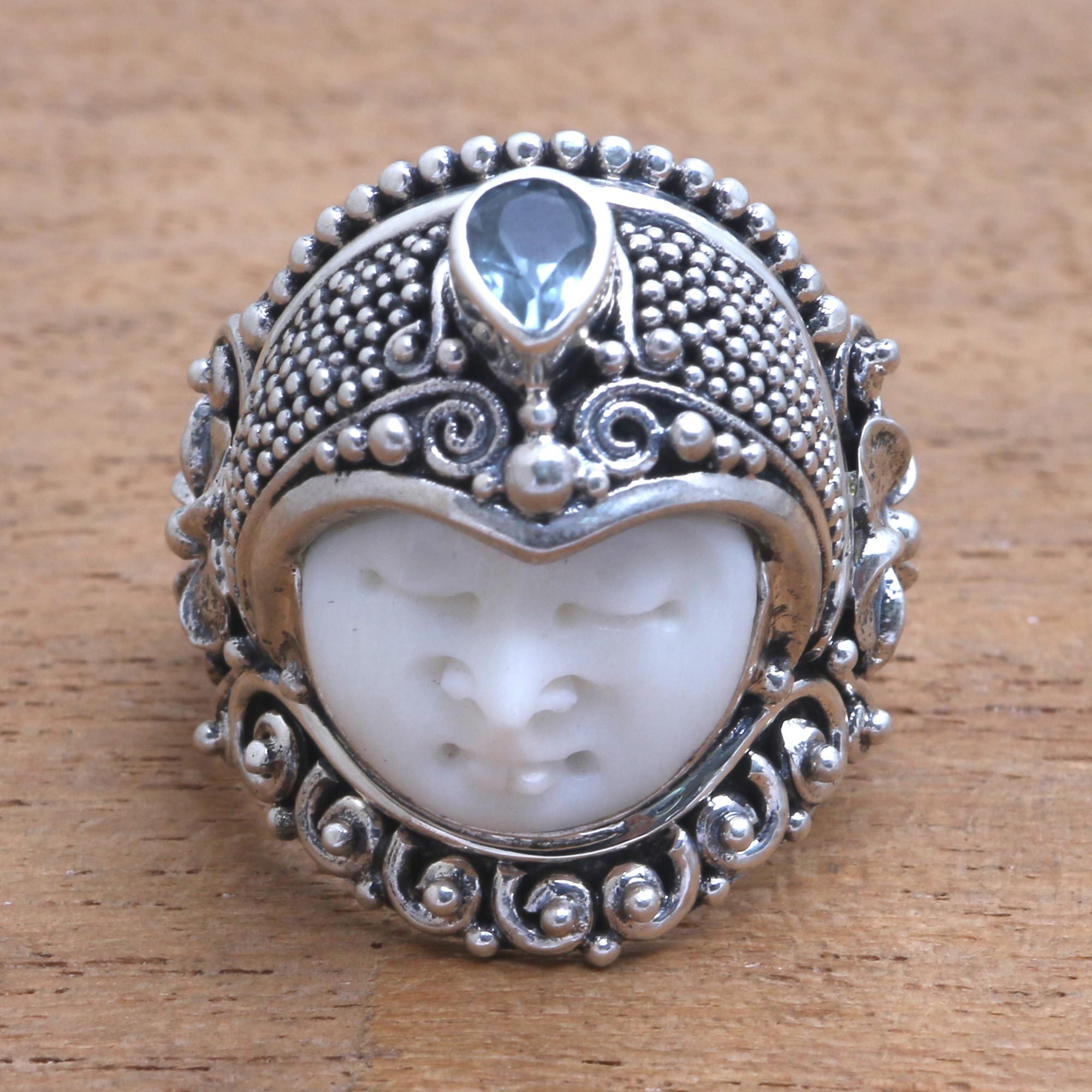 Carved by hand from tone, the face of a Balinese prince wears a handcrafted crown of sterling silver. Buana designs this intricate and beautiful cocktail ring, displaying a blue topaz gem.