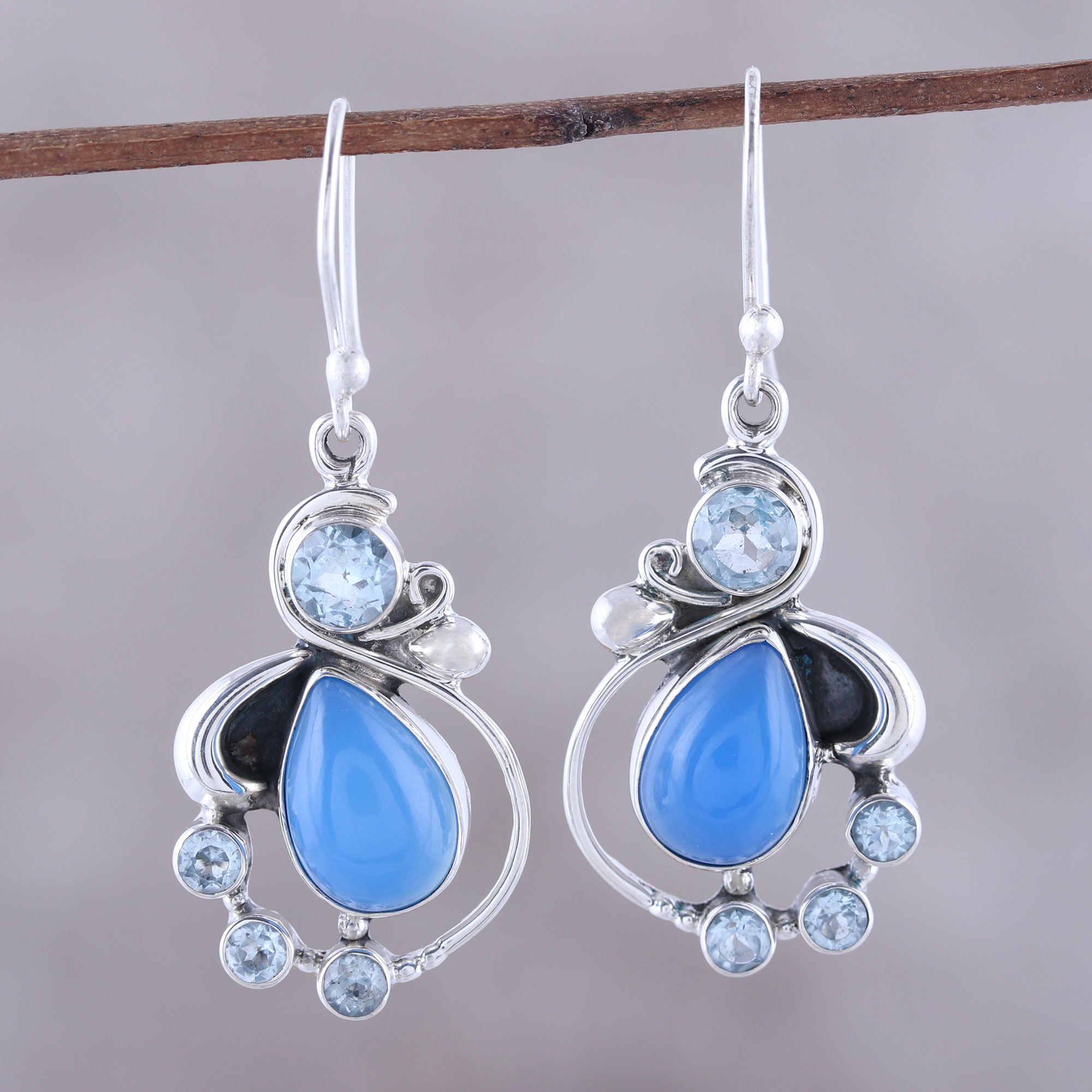 Intricate forms in sterling silver create an elegant pair of dangle earrings. Working with local Indian artisans, Shanker presents the earrings, featuring teardrops of blue chalcedony alongside blue topaz gems that sparkle like morning dew.