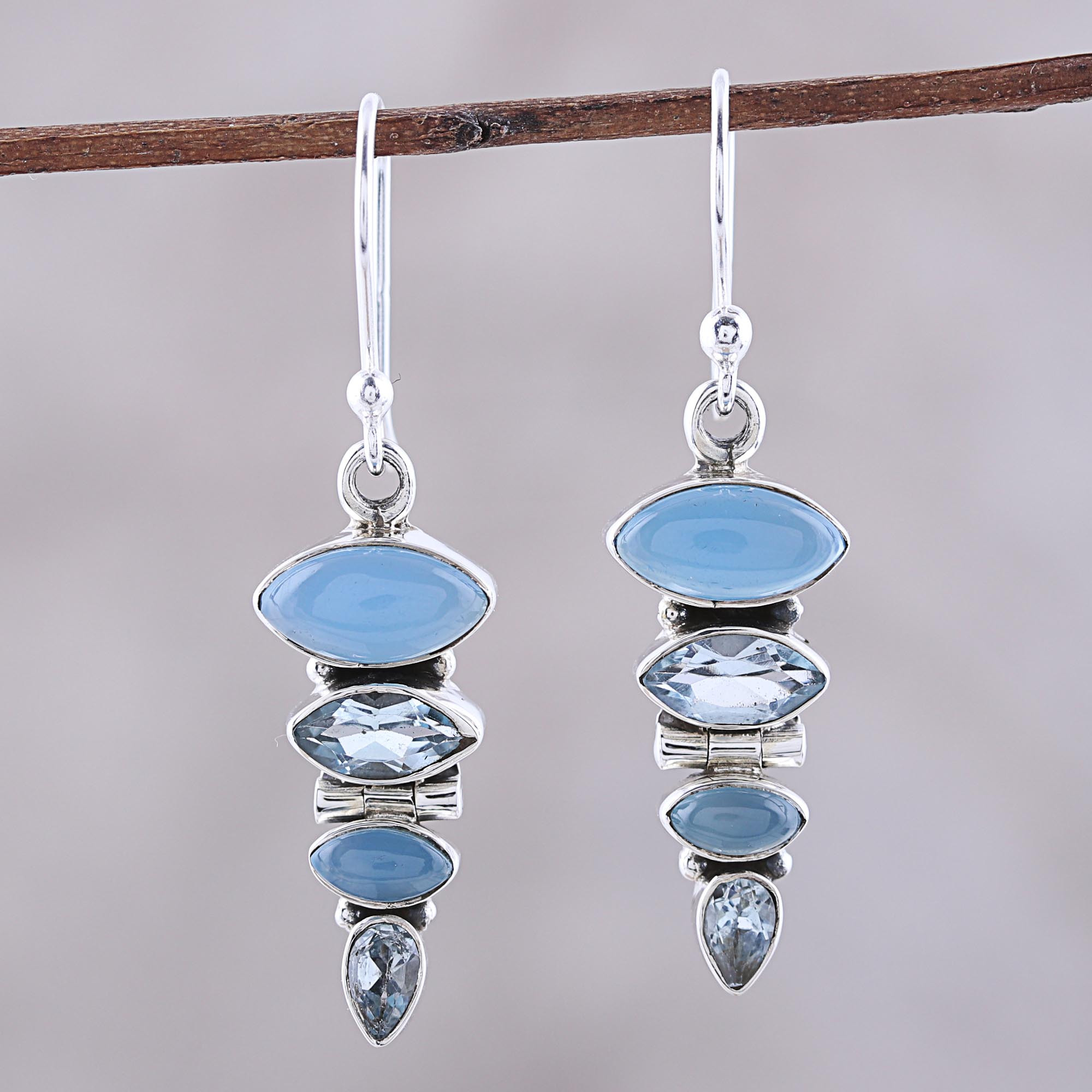 Blue Topaz and Chalcedony Sterling Silver Dangle Earrings, 'Falling Stars'
