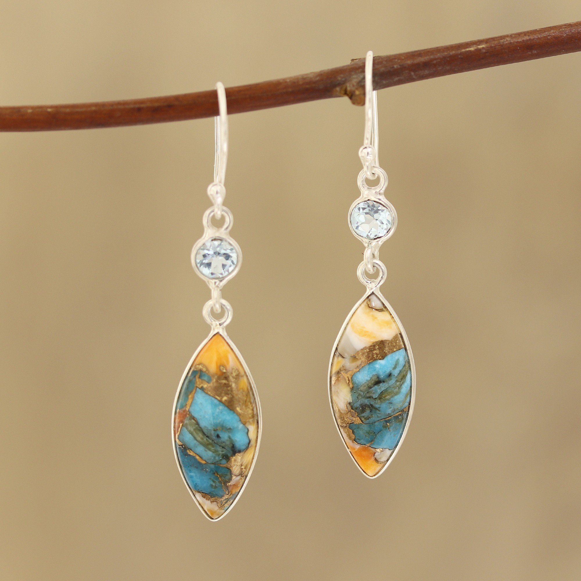 Evoking the elegance of the beach, these Indian earrings feature petite blue topaz gems that dangle above pieces of oceanic blue and sandy beige composite turquoise.