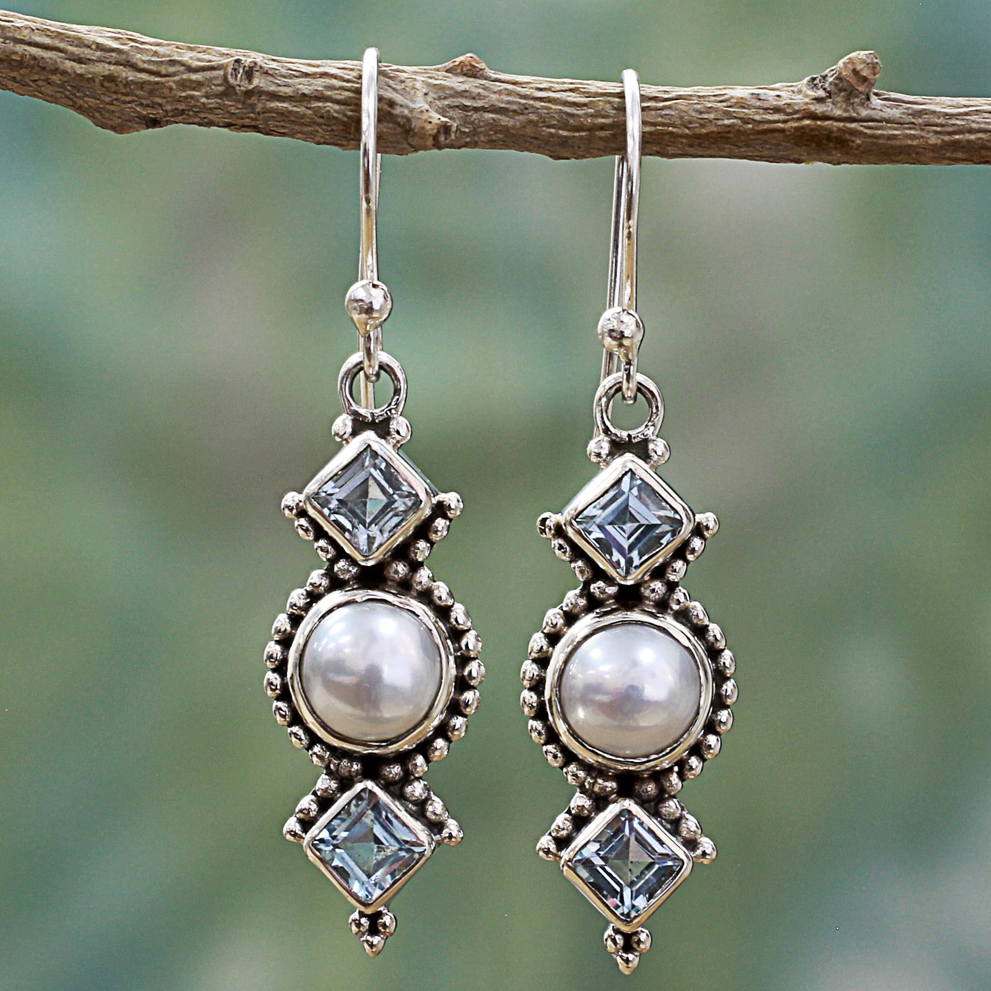 Square blue topaz gems flank round cultured freshwater pearls in intricate sterling silver settings in this elegant design presented by Neeru Goel of India. In a refreshing color palette of silver, natural cream and pale blue, these sleek dangle earrings reflect free-spirited beauty.