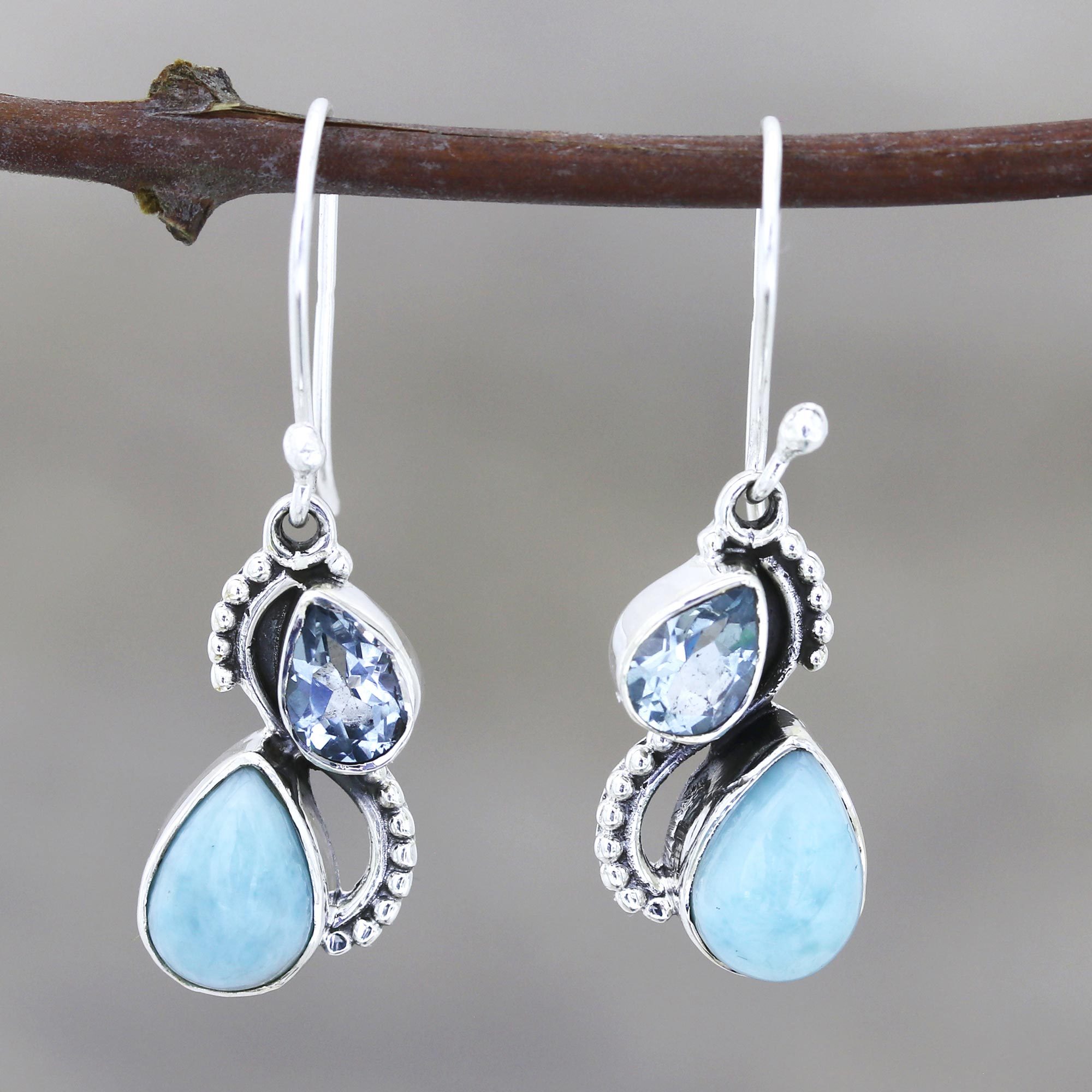 Blue topaz gems totaling 1.5 carats nestle beside teardrops of sky blue larimar in a design that celebrates their differences. From Shanker in India, these beautiful earrings are handcrafted of sterling silver to showcase the lovely gems.