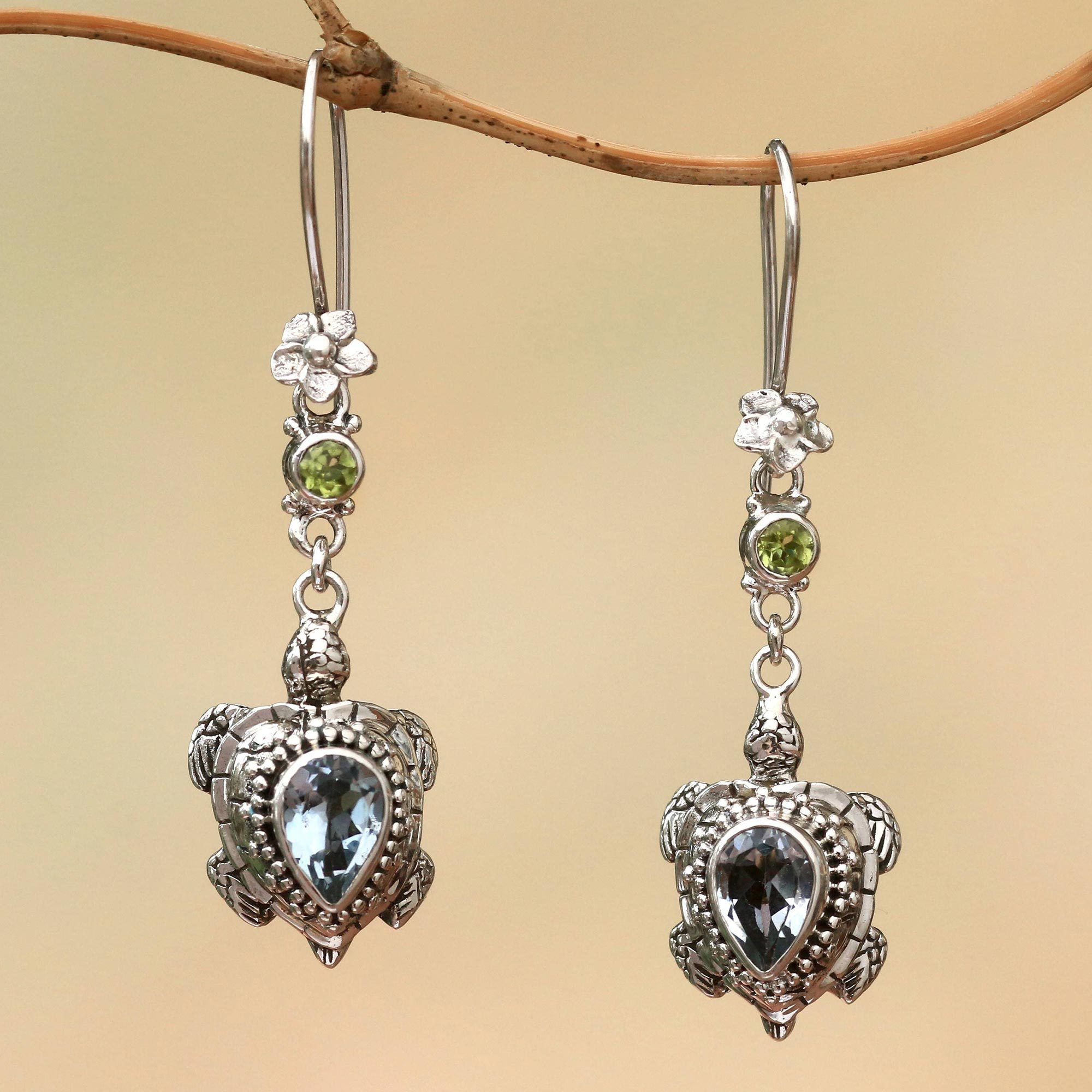 Crafted of sterling silver, two lovely turtles are featured in this pair of dangle earrings from Bali. Designed by Buana, the earrings are fit with 2.5 carats of sparkling blue topaz and peridot. Gleaming jepun, or frangipani flowers complete the earrings.