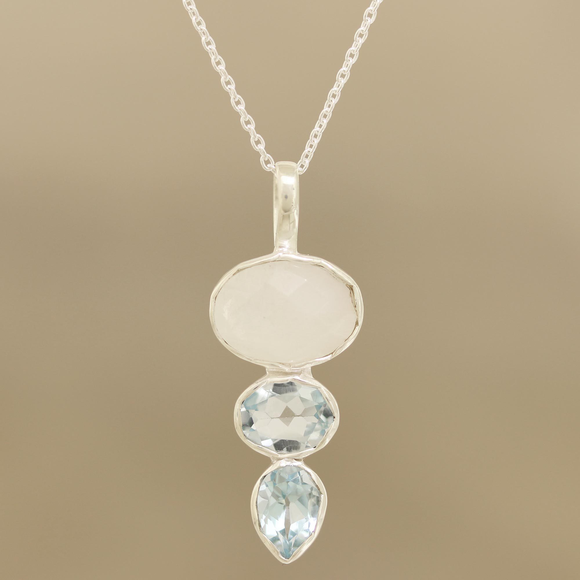 Glowing and glittering side-by-side, blue topaz gems combine with an oval of rainbow moonstone, totaling 10 carats altogether. Neetu Barathi designs this fascinating pendant necklace from India. It is crafted by hand from high-polish sterling silver.