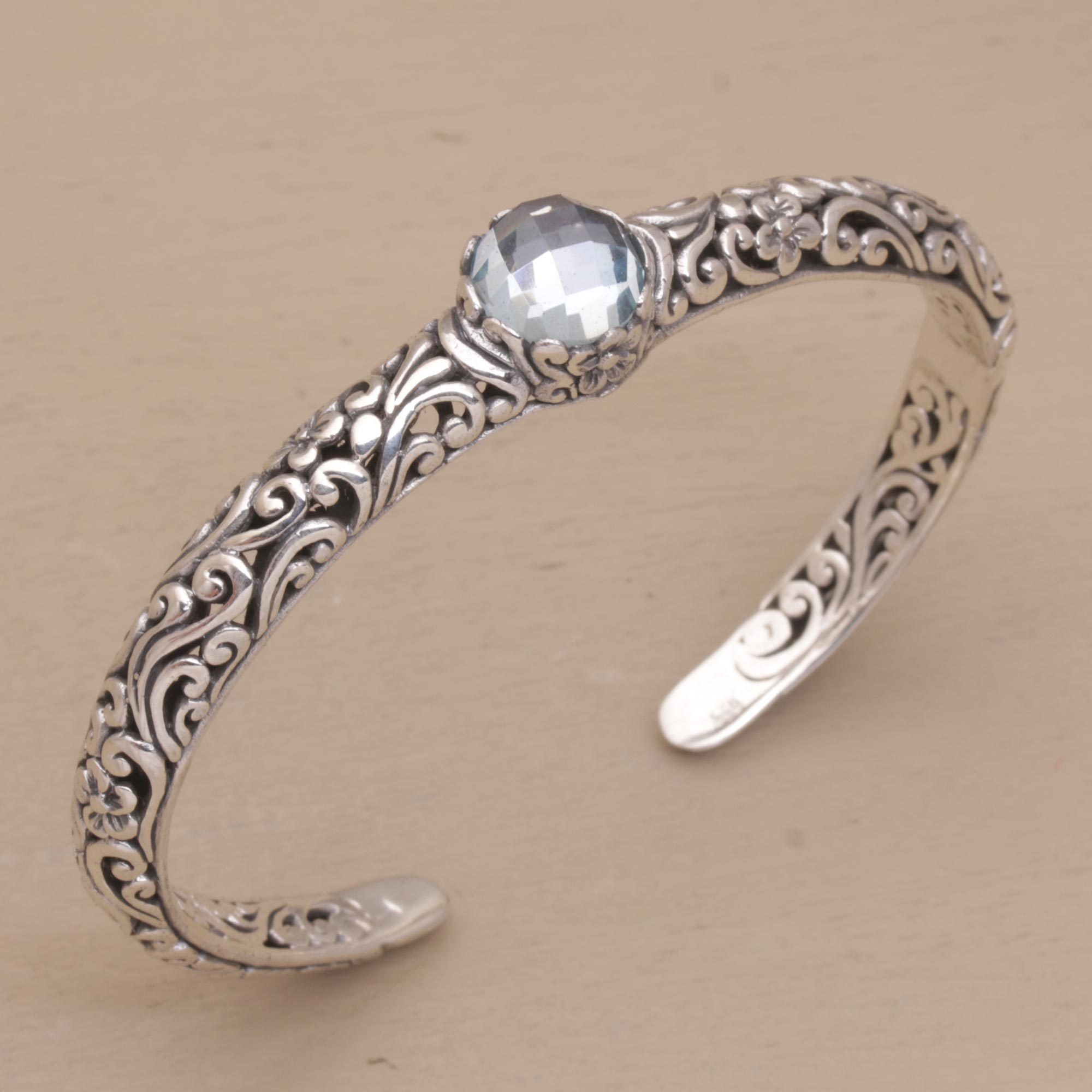 Shining tendrils intertwine to evoke the dense rainforests in Bali. From Komang Wijayana, this feminine bracelet is lovingly crafted by hand with sterling silver. A five-carat faceted blue topaz crowns the slender cuff. It features a concealed hinge at one side for an easy fit.