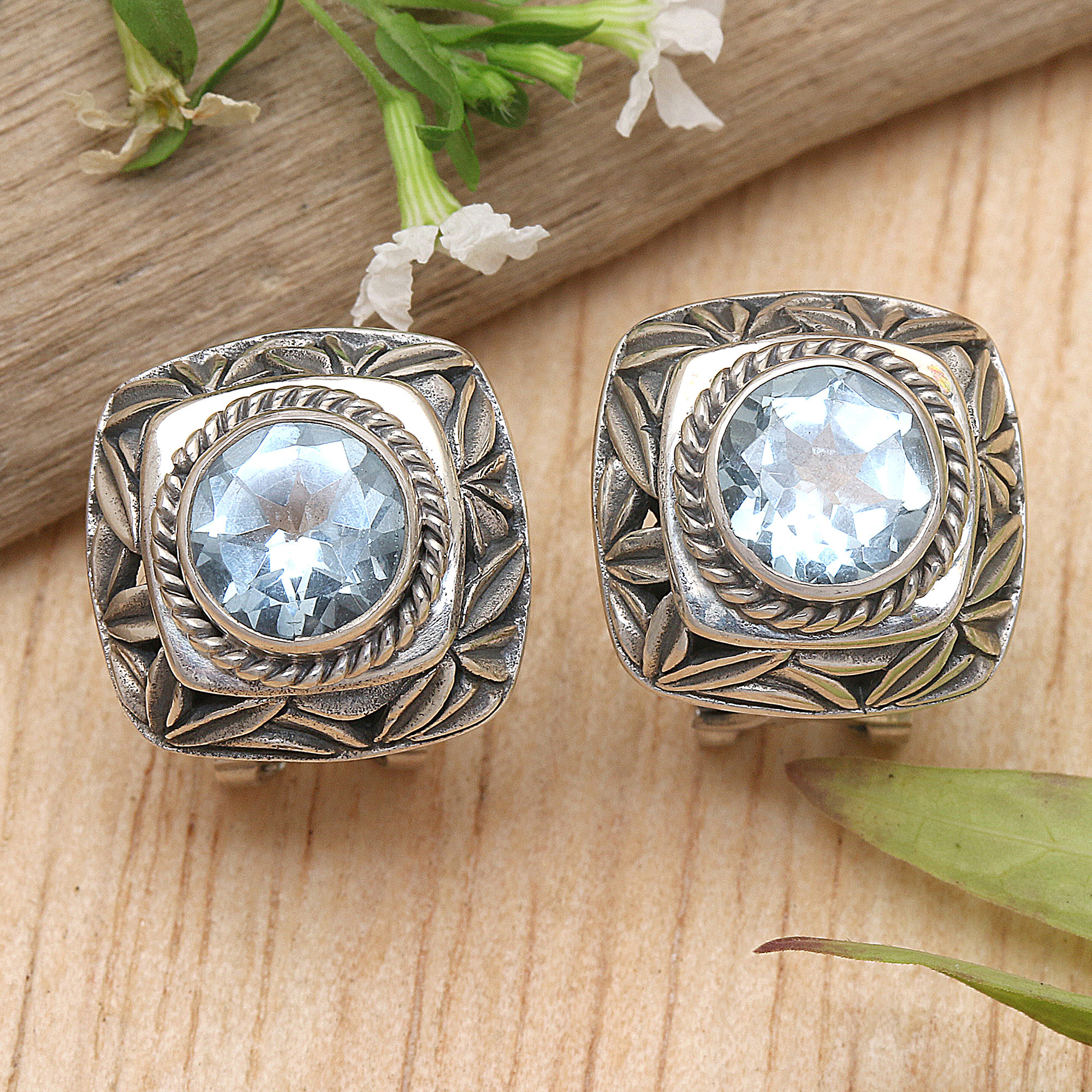 A bamboo canopy is crafted in sterling silver openwork, circling three carats of sparkling blue topaz gemstones. Bringing the beauty of the Balinese countryside to the wearer, these button earrings are presented by Kadek Wijanegara.