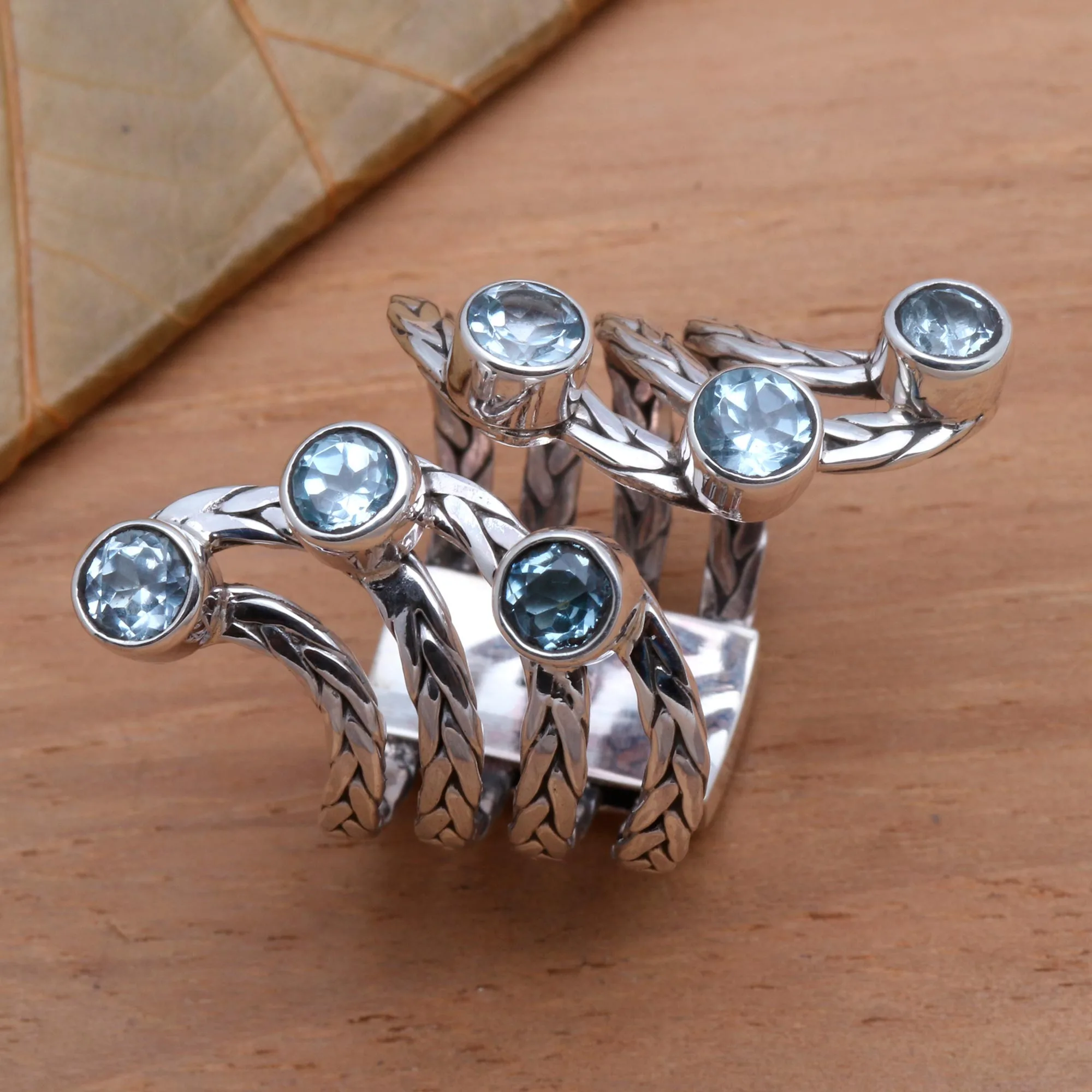 Budiharta in Bali designs this striking cocktail ring, which features approximately 1.5 carats of sparkling blue topaz. The gems are set on curving braids of polished sterling silver, which are united at the back of the band.