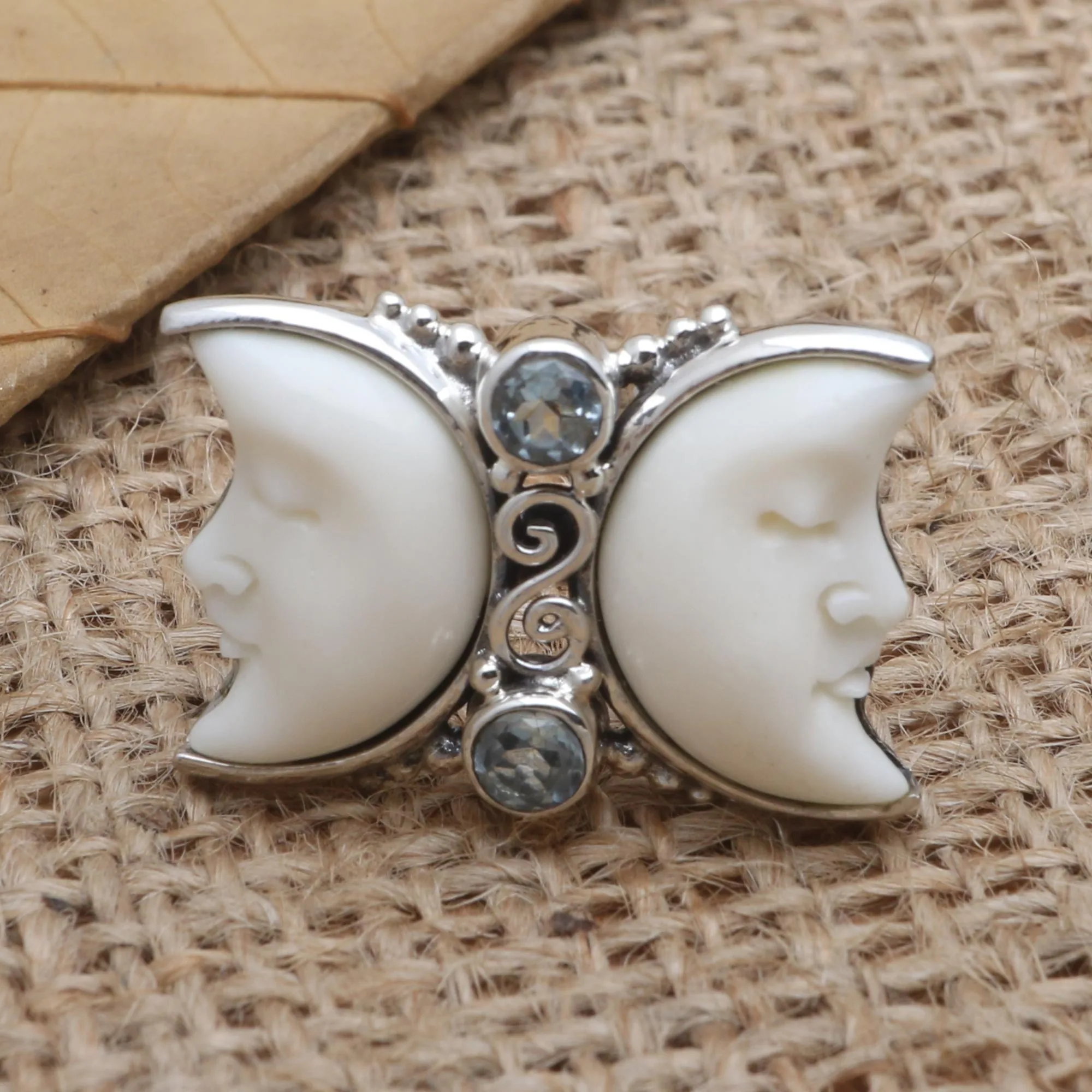 Using the glowing moon over Bali's Uluwatu beach as inspiration, Buana designs a stunning cocktail ring that's sure to attract attention. The artisan hand carves two crescent moons from pale bone to create the ring, sandwiching two faceted blue topaz gems between the crescents. Sterling silver accents and a polished silver band finish the ring with shining details.