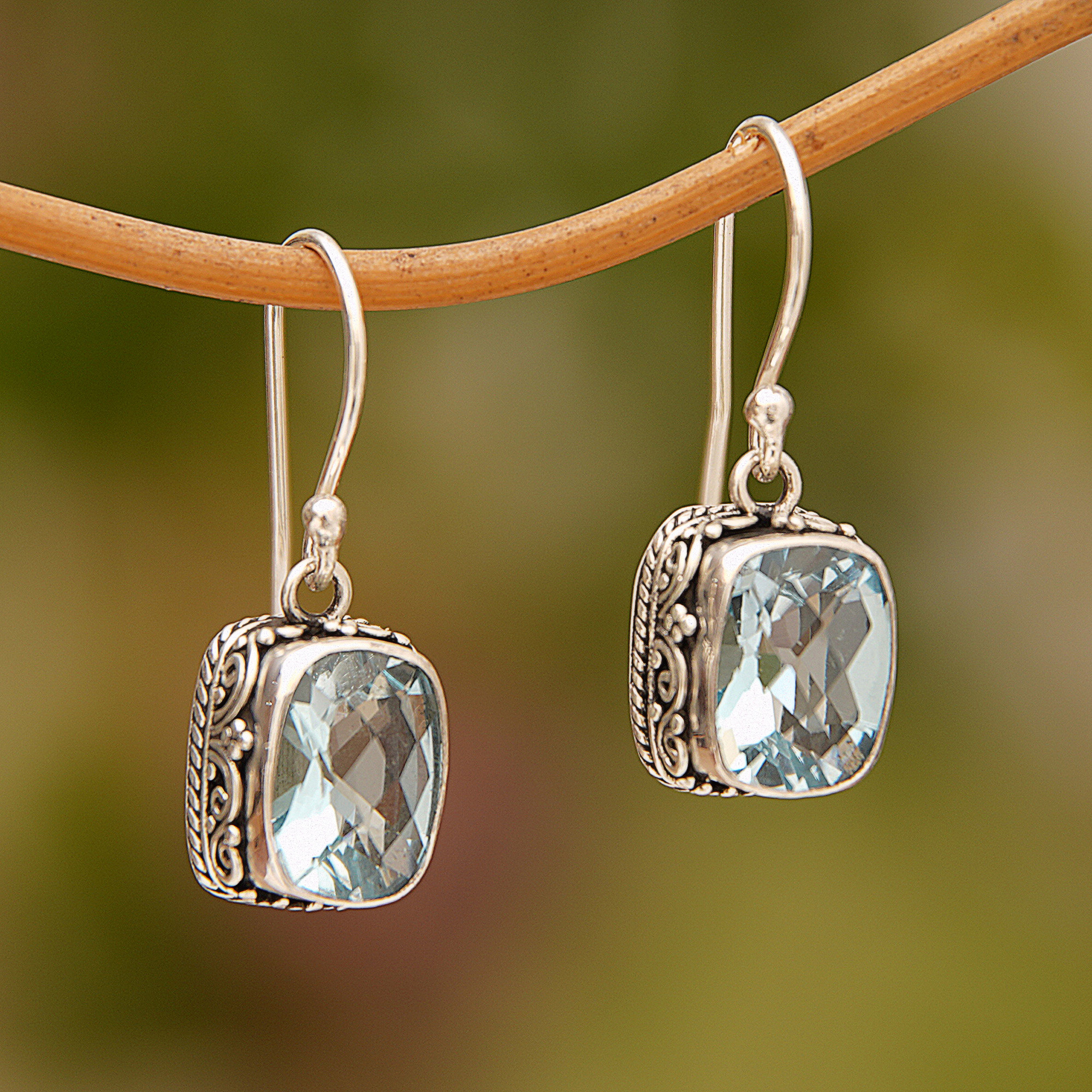 Gleaming with the beauty of an Indonesian temple, these dangle earrings from Bali are crafted with sterling silver designs that frame eight carats of rectangular blue topaz. Komang Wijayana presents this spectacular accessory, crafted by local artisans.