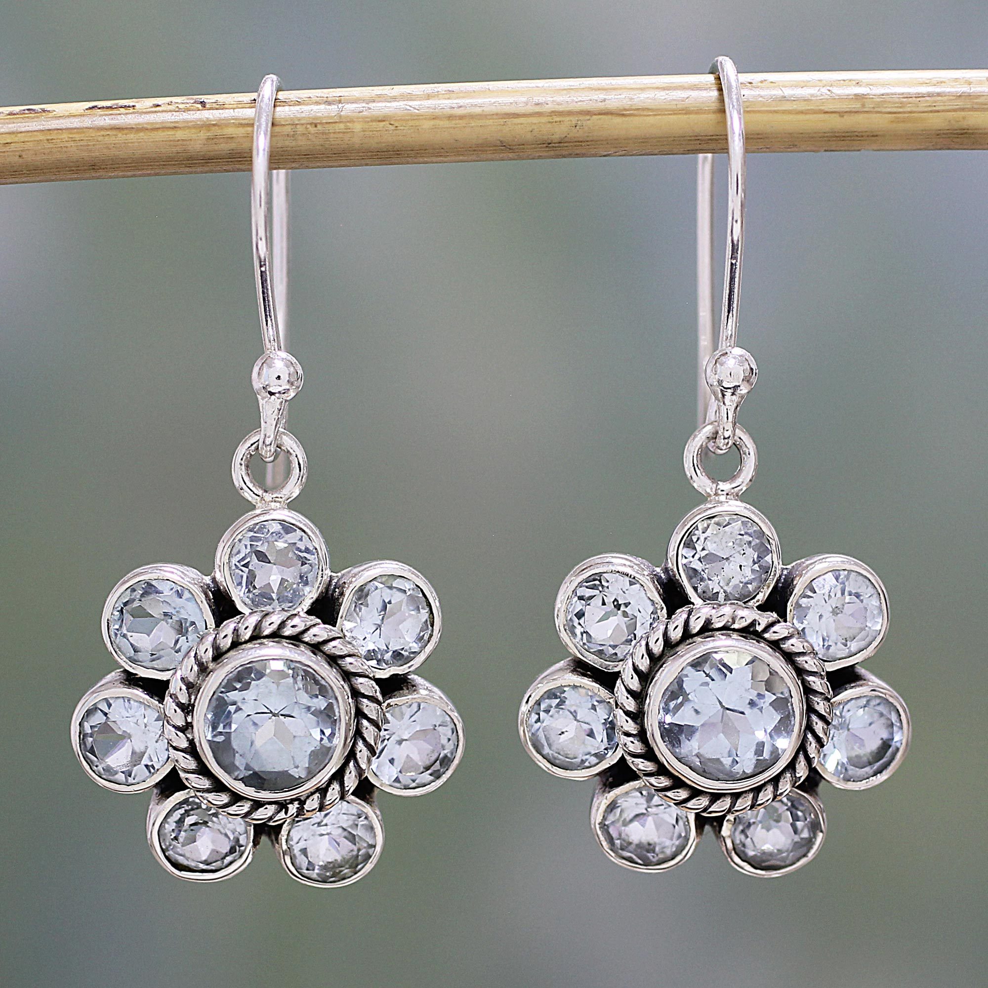 Graceful floral shapes capture the morning light with over four carats of sparkling blue topaz stones. Gracing the ears on hooks, these dangle earrings are crafted of sterling silver with rope motifs. The pretty design is presented by India's Neeru Goel.