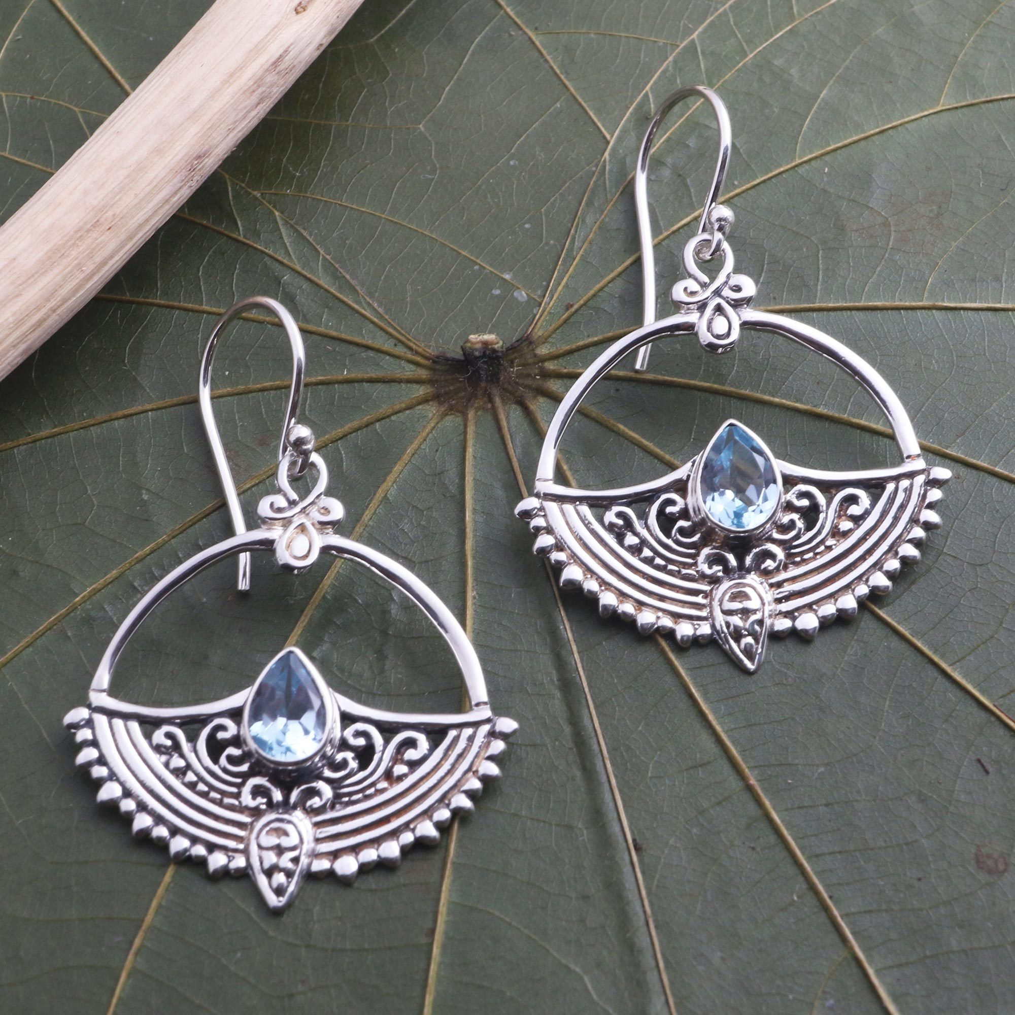 Faceted blue topaz teardrops clutch intricate half moons of sterling silver in these circular dangle earrings by Bali's Ari Gunawan. Oxidized to emphasize the intricate details, the earrings hang from silver hooks.