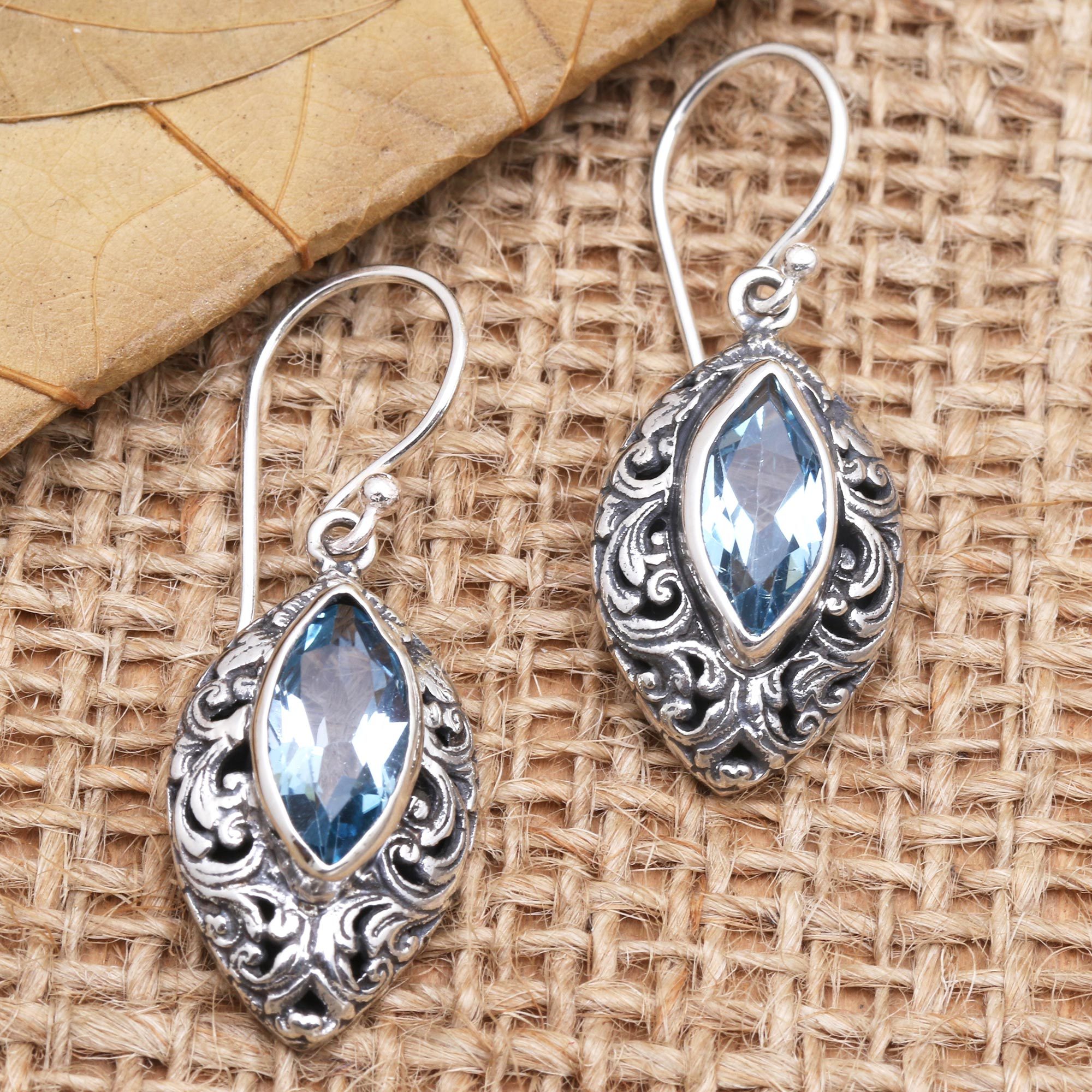 Bali's Ni Wayan Astiti designs a pair of earrings with simplicity and elegance. The artisan uses a faceted, marquise blue topaz gem to center each earring, nestling the stone in a bezel setting surrounded by oxidized sterling silver designs.