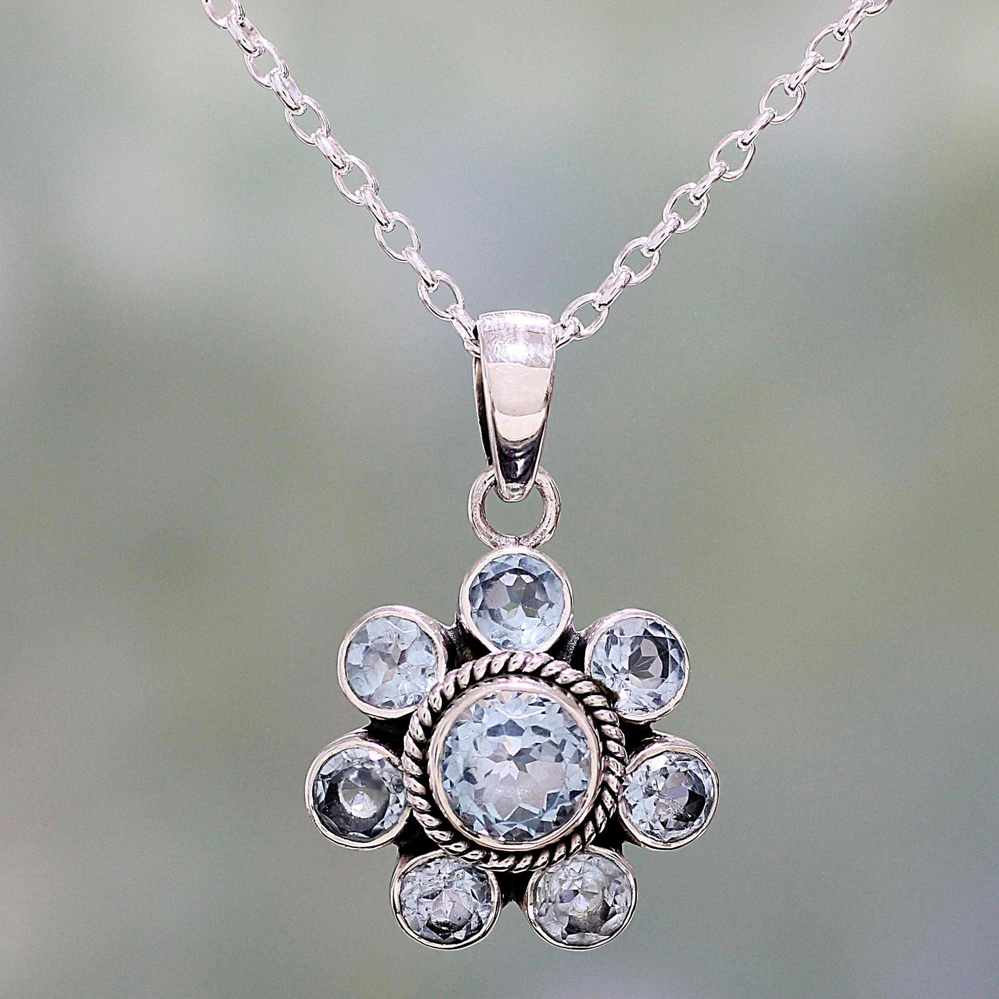 Blue Topaz and Sterling Silver Pendant Necklace from India, 'Morning Glitter'
