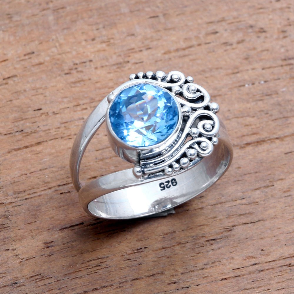 Accentuated by regal patterns in sterling silver, a 2.5-carat gem of sparkling blue topaz crowns this cocktail ring from Bali. Rosalia Tarigan designs this beautiful accessory.