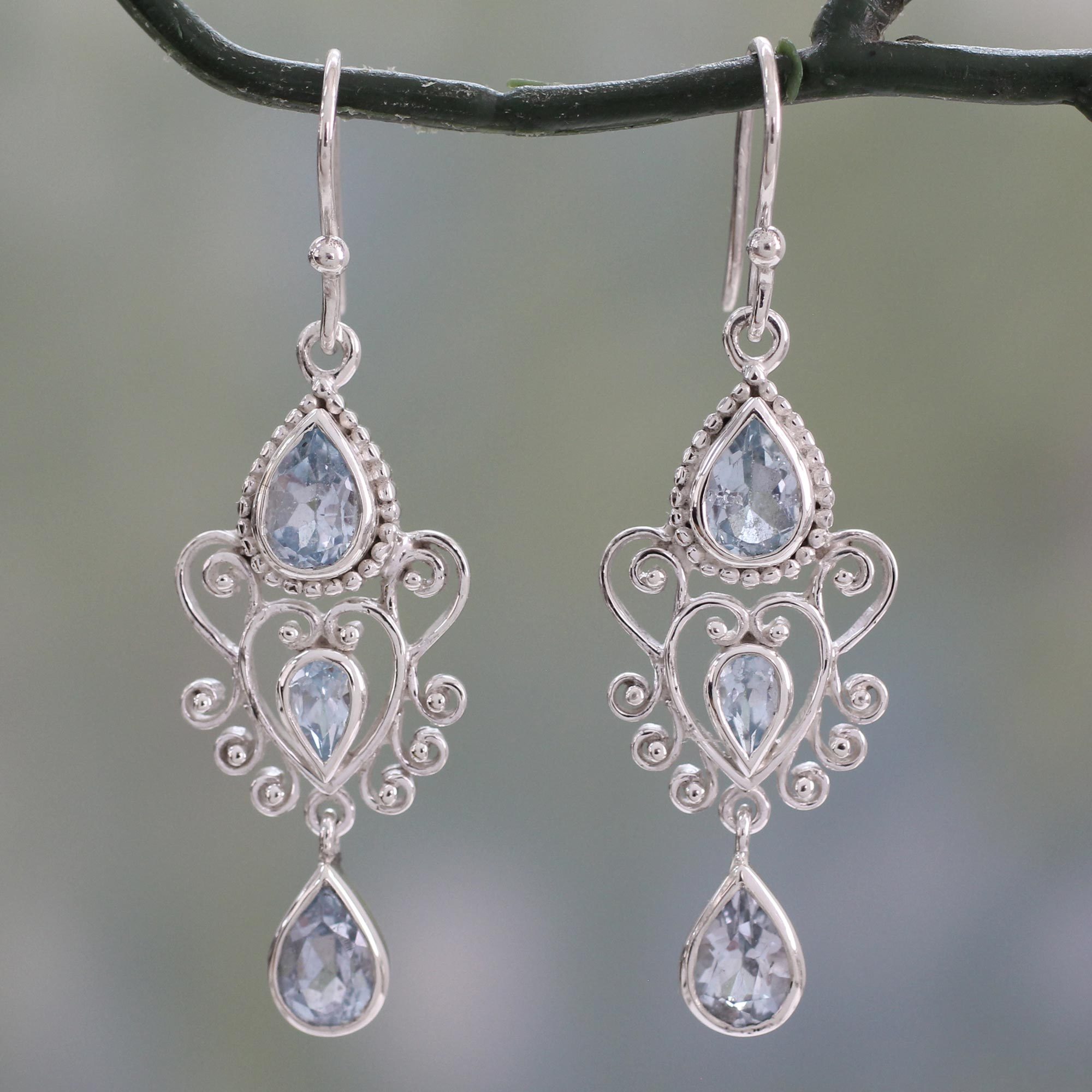 Cast your own spell of enchantment with these mesmerizing earrings from India's Shubhra Singh. Elaborate heart-shaped motifs in sterling silver are flanked top and bottom by teardrops of pale blue topaz. The dangle earrings feature over 3 carats of the cool gemstone, including smaller teardrops at the hearts' centers. The earrings sway on sterling silver hooks.