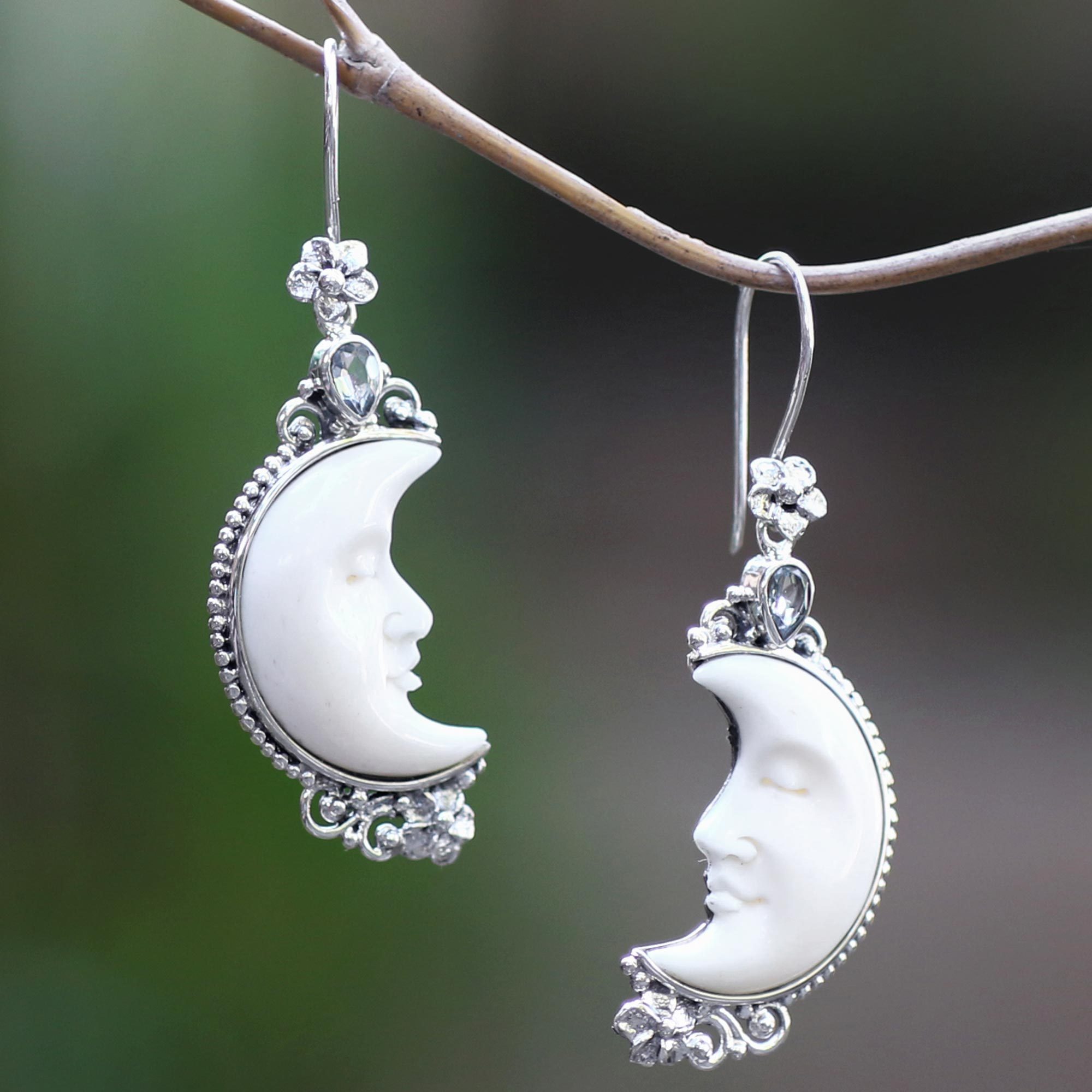 Caught up in a peaceful dream, a crescent moon carved of smooth bone slumbers in these earrings from Buana in Bali. The bone is set in a sterling silver bezel with frangipani blossom accents. Crowning each earring is a sparkling teardrop of blue topaz.