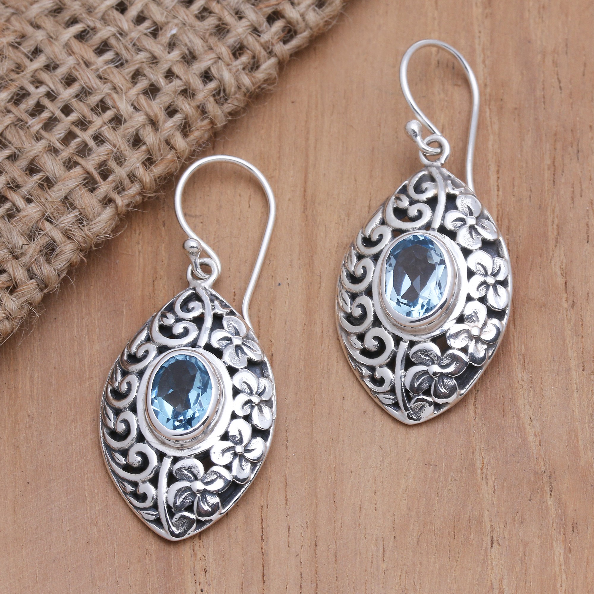 Made Sudiari combines patterned leaves and shimmering frangipani flowers to create these glorious dangle earrings. The Balinese artisan hand crafts each marquis earring from sterling silver, engraving the precious metal with intricate designs. At the center, a faceted blue topaz sparkles in a bezel setting.