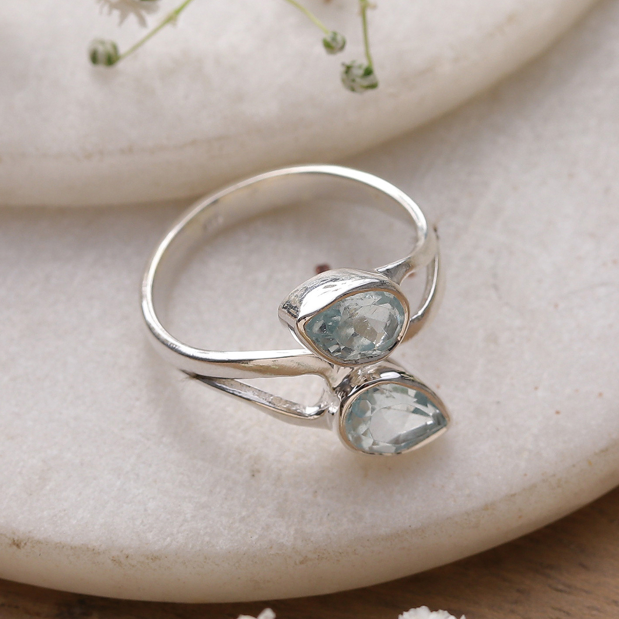 A twisting vine is handcrafted of sterling silver, circling the finger with a fascinating gleam. Presented by Parul, this Indian wrap ring is completed with two carats of teardrop blue topaz gems that sparkle at the front.