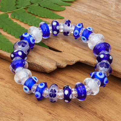 Make a bold statement with this handmade stretch bracelet where blue and white handblown glass beads create a kaleidoscope of patterns. Each bead is a miniature work of art, carefully crafted by Thai artisan Alexx Cheng using age-old techniques and strategically interspersed with clear crystal beads. Versatile and stylish, it's the perfect finishing touch for any outfit.