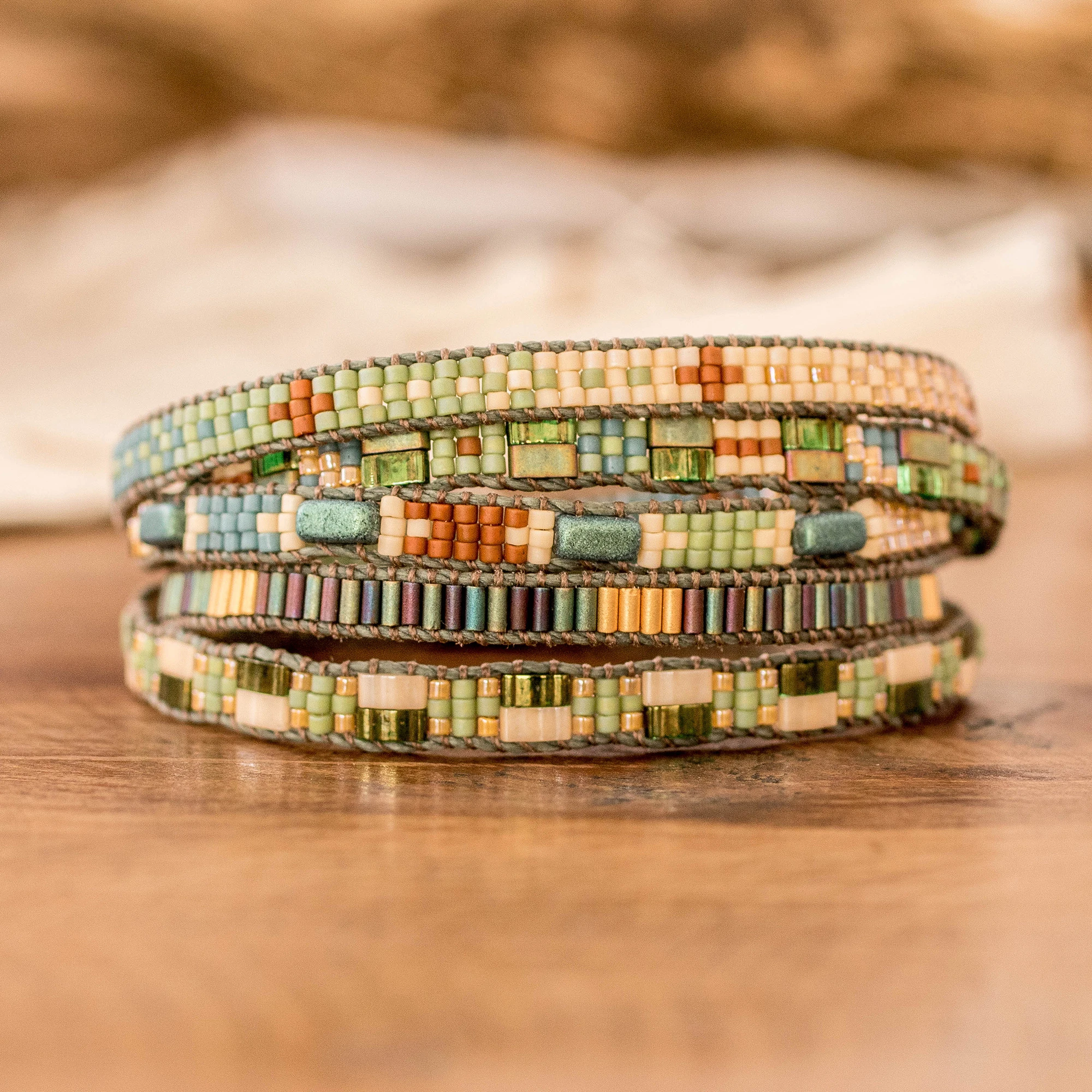 Bohemian Hand-Loomed Beaded Wrap Bracelet with Pewter Button, 'Harmony of Hues'