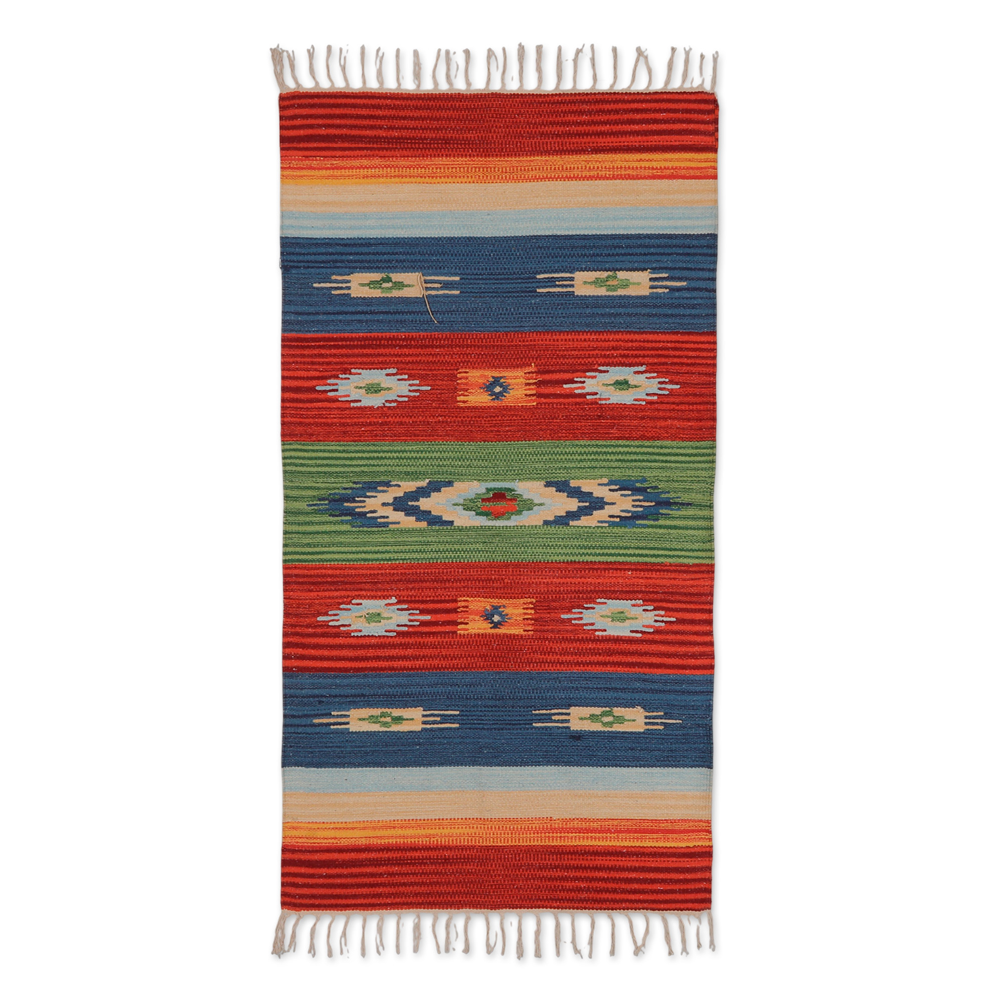 Bold geometric designs dance across handloomed cotton in this vibrant dhurrie area rug that proves functional pieces can be beautiful too. The meticulous weaving technique produces crisp details and striking color combinations that anchor a room's aesthetic, while soft fringes frame the edges with handcrafted charm. Easy to move yet built to last, it adapts seamlessly to various decorating styles. This textile treasure presented by Mahmood honors ancient Indian weaving methods in every carefully placed thread.