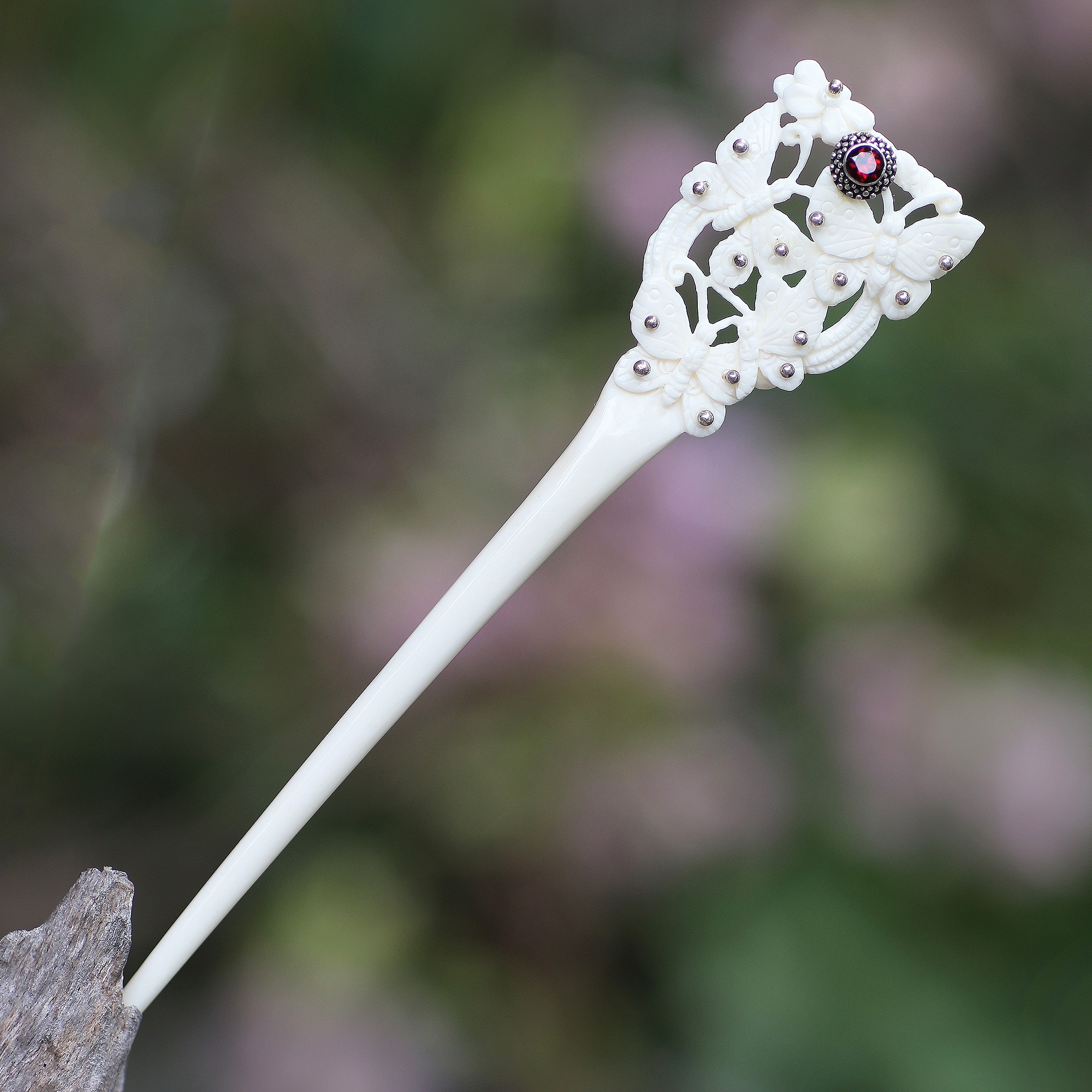 Sharing their love, a host of butterflies race to a flower. Designed by Ayu Ary, this intricate hair pin is diligently hand-carved from bone and studded with sterling silver. A sparkling garnet gem framed by sterling silver accentuates this accessory.