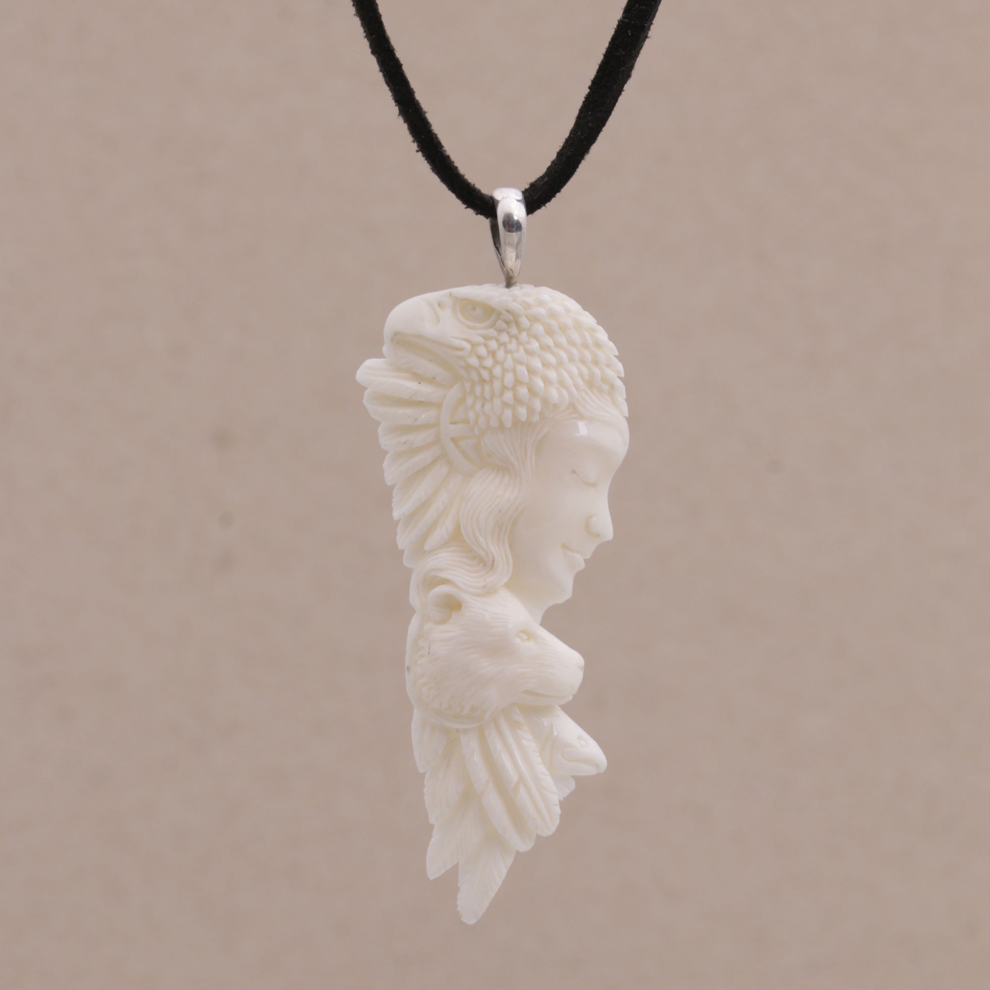 The joy and majesty of nature is celebrated in this pendant necklace from Bali. Working with local artisans, Made Wardika carves a piece of bone to depict the face of a man, accompanied by an eagle, a wolf, and a fish. This noble pendant centers a length of leather cord.