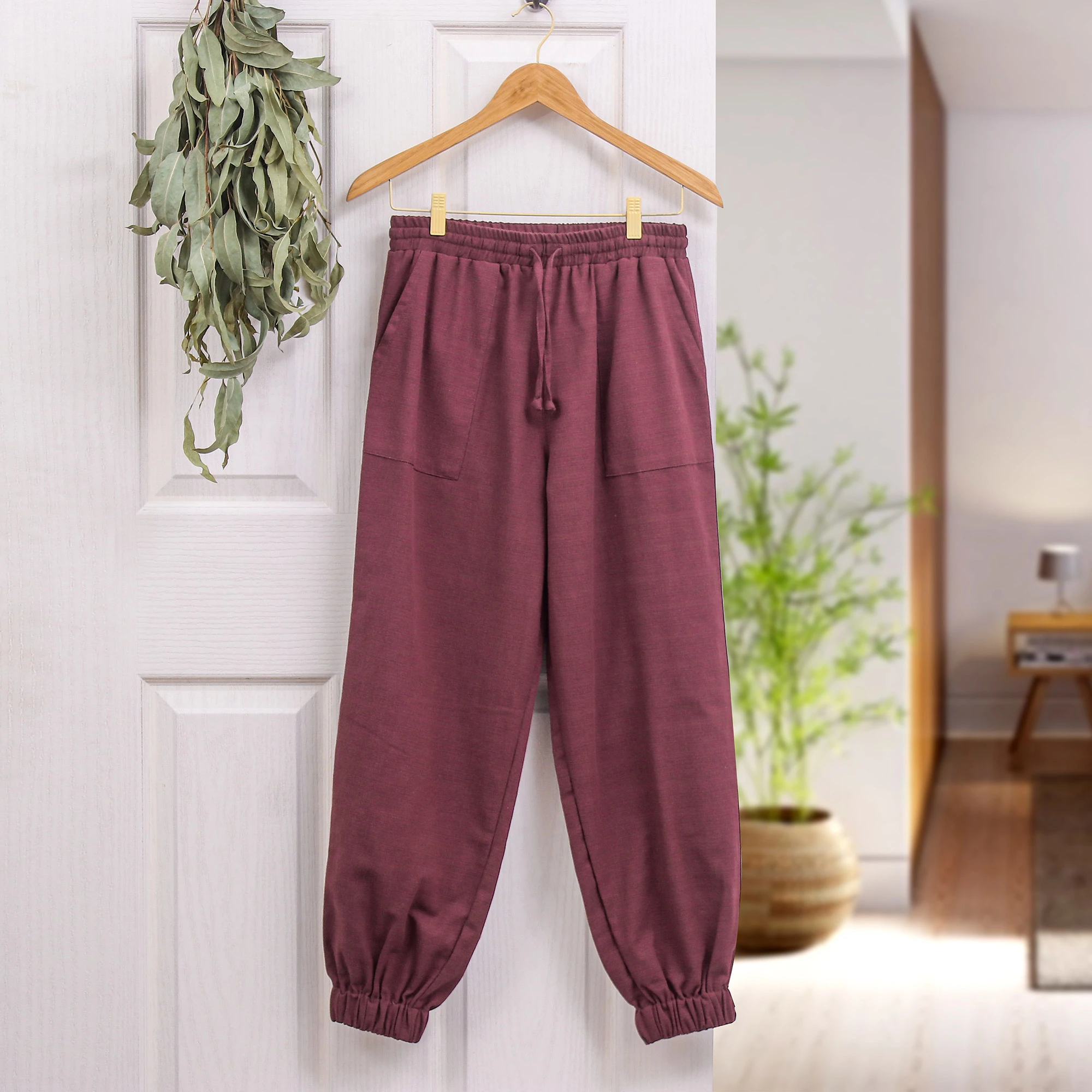Bordeaux Cotton Twill Jogger Pants with Drawstring Waist, 'Casual in Wine'