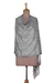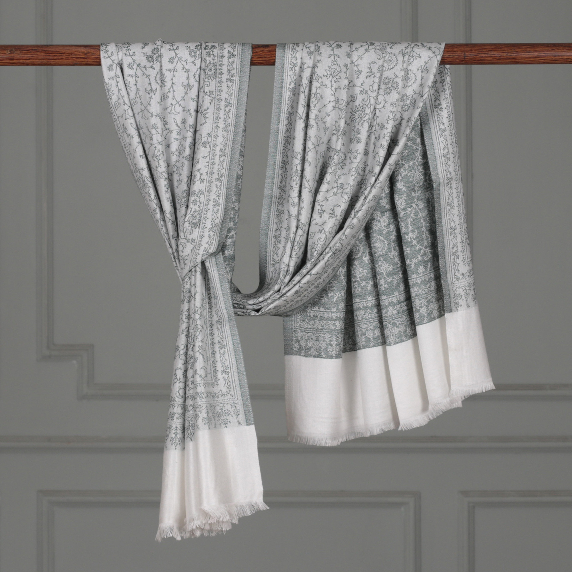 Delicate as morning mist, this modal shawl woven with the jacquard technique showcases the refined vision of India's Amit Moza in a serene palette of ivory and sage green. Graceful floral and vine patterns meander across the soft fabric like a secret garden frozen in silk, creating an enchanting tapestry of nature-inspired beauty. Finished with softly fringed ends, this ethereal accessory brings an air of tranquil sophistication to any wardrobe.