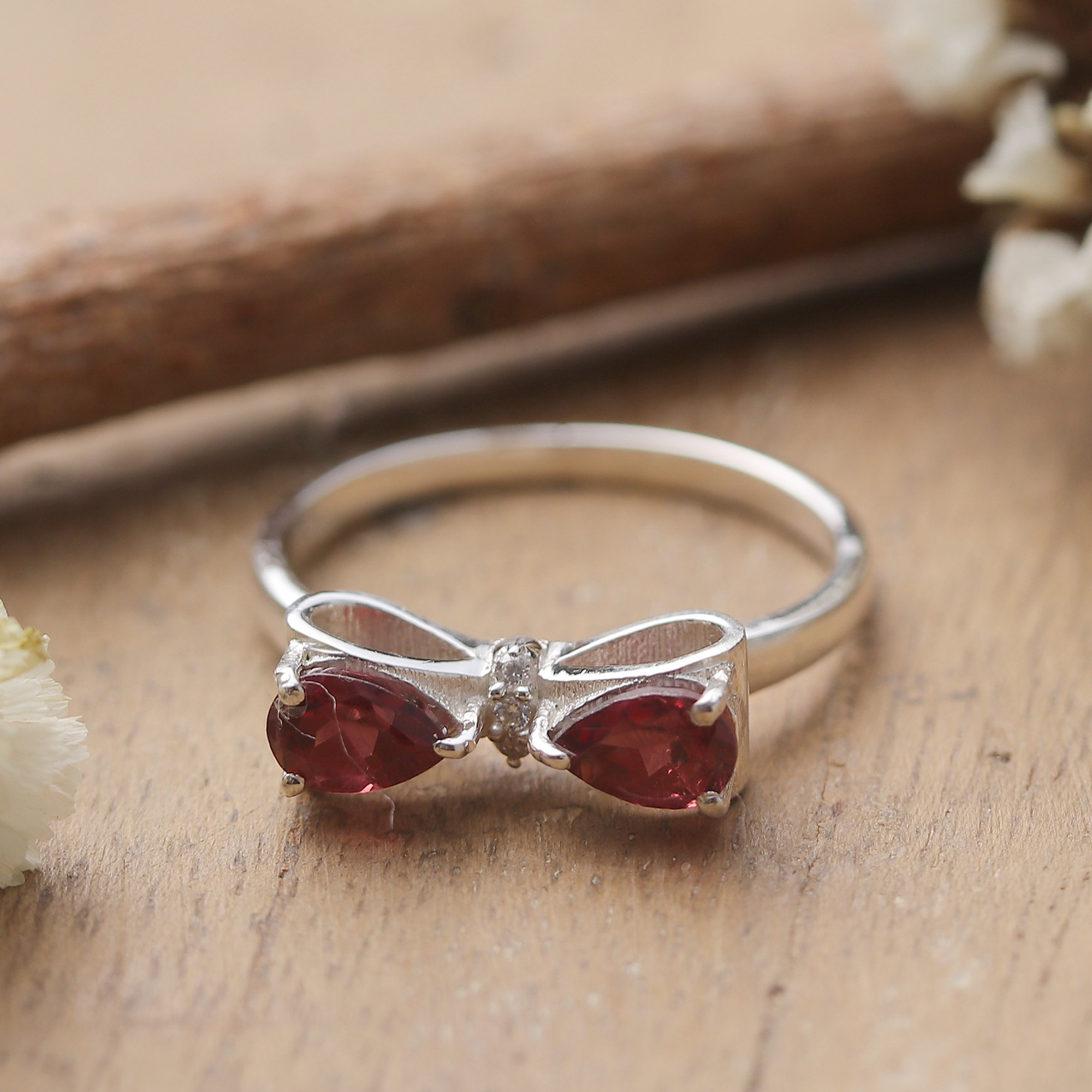 Bow Tie-Inspired Garnet Sterling Silver Cocktail Ring, 'Fiery Bow'
