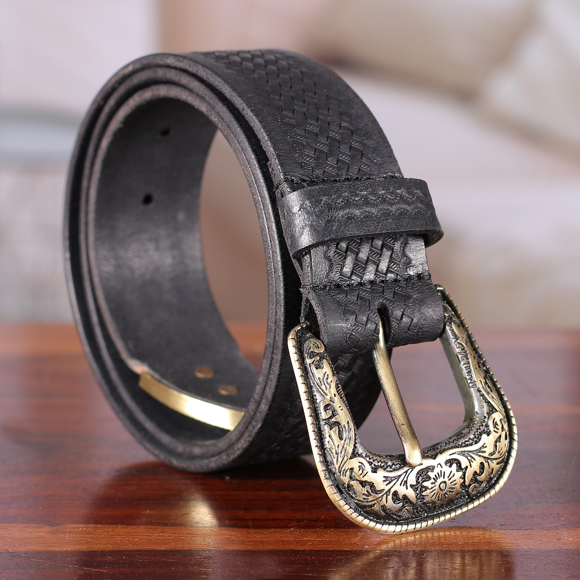 Braid-Patterned 100% Onyx Black Leather Buckle Belt for Men, 'Versatile Onyx'
