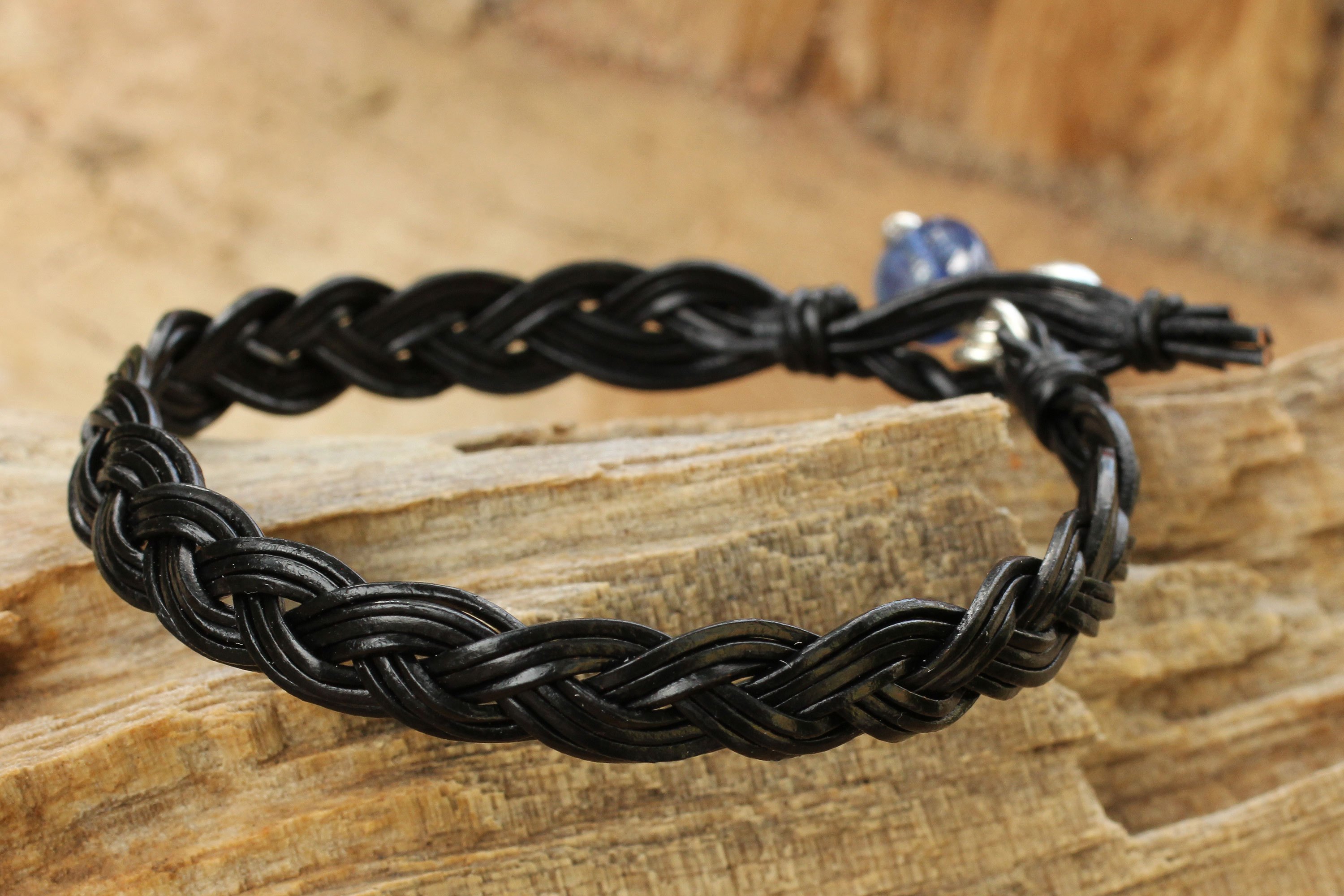 Siriporn crafts a beautiful bracelet, braiding black leather by hand. Featuring blue kyanite and silver beads from Thailand's hill tribe artisans, the bracelet closes with a tinkling bell.
