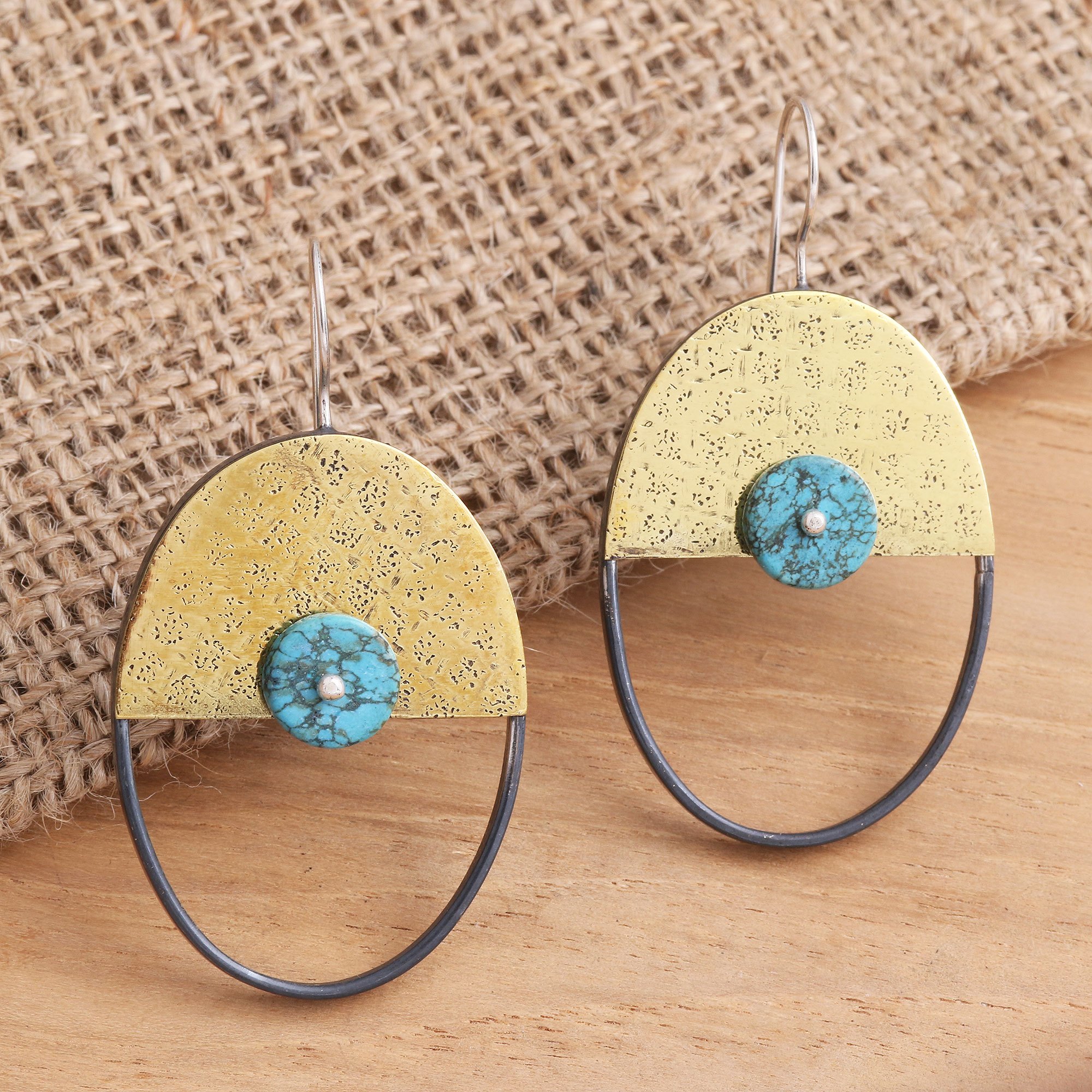 Contemporary design meets primitive inspiration in this environmentally conscious collection of statement jewelry. Presented by the Pertiwi Collection of Bali, these drops earrings, crafted from textured brass, feature polymer clay circles that mimic the look of turquoise and sterling silver ear hooks.