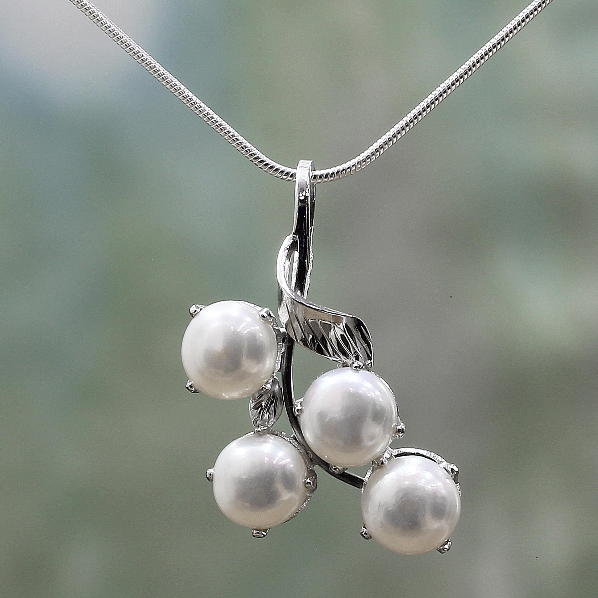 Clustered in a shimmering bouquet, four white pearls hang from sterling stems. From Alok Jain, the pearls in this necklace represent purity, honesty and innocence.