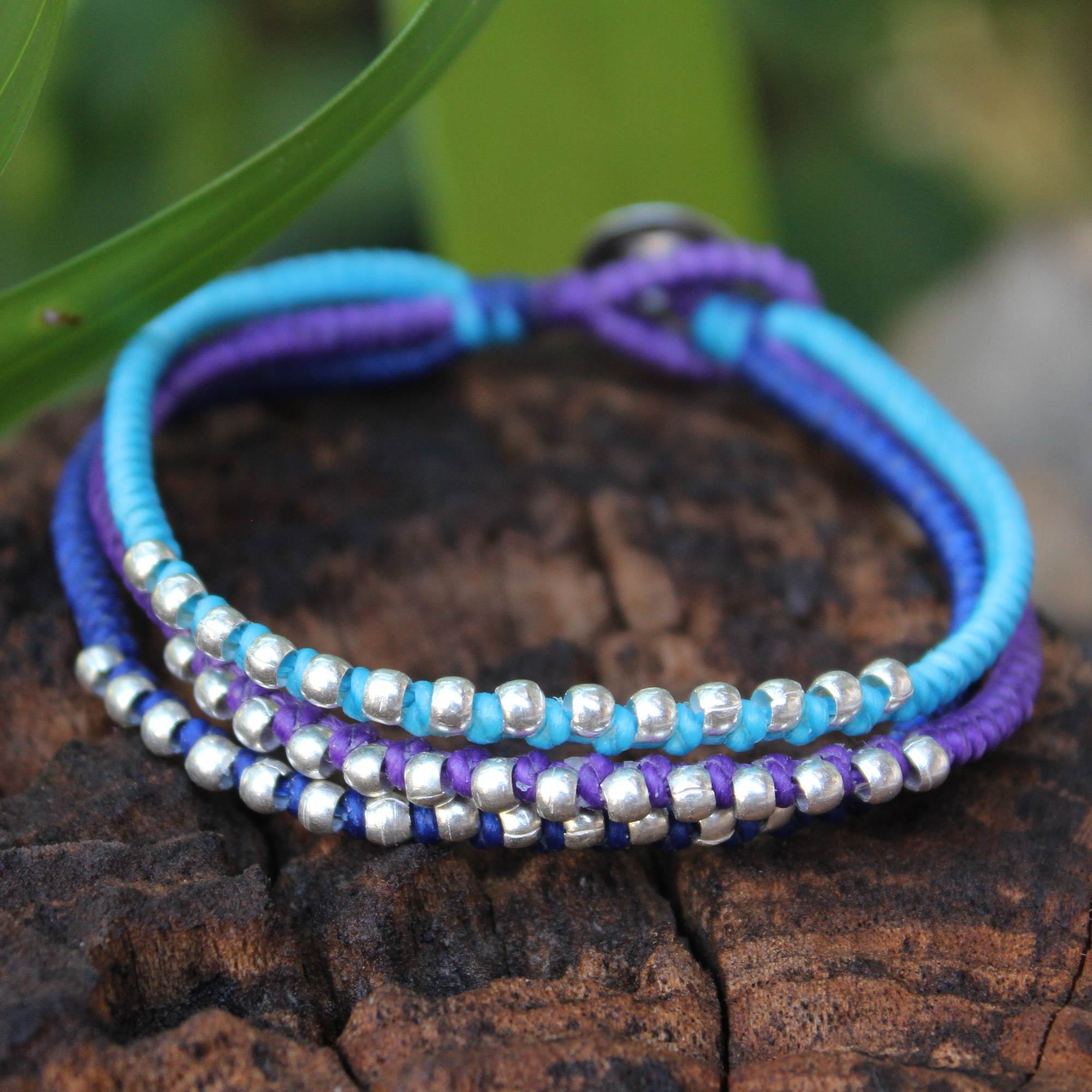 Bringing bright, intense shades of blue and purple to your outfit, this bracelet is an unforgettable addition. By Napapat of Thailand, it is crafted by hand and includes .950 sterling silver beads as accents. The polyester braids make this bracelet a great choice for people who dislike the feel of metal on their wrist.