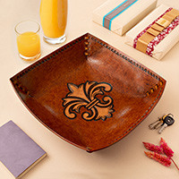 Brown Hand Tooled Leather Catchall Plate from Peru, 'Colonial Florals'