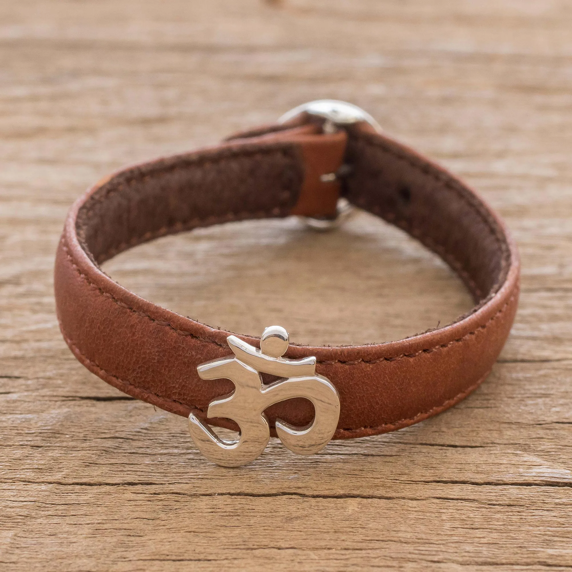 Brown Leather and Sterling Silver Om Bracelet, 'Resplendent Om'