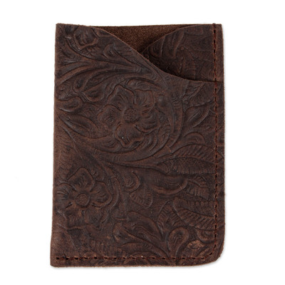 Brown Leather Card Wallet with Embossed Floral Motifs, 'Vertical Floral Pass'