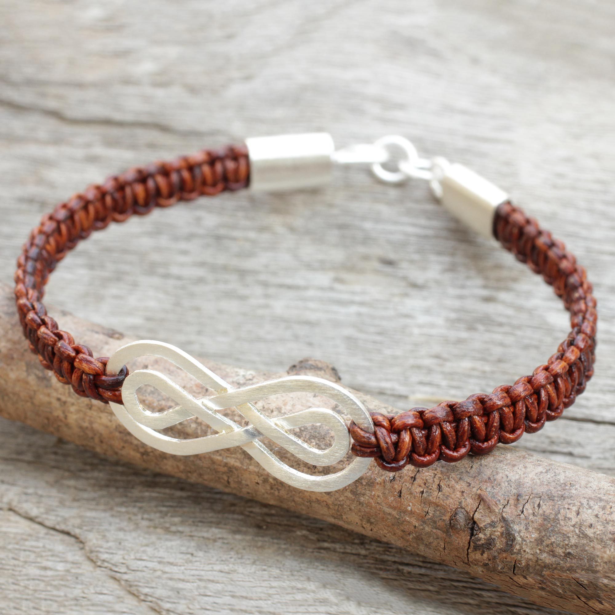 Knotted by hand, this brown leather bracelet features a sterling medallion based on the sign for infinity. Sarote Lochotinunt crafts this beautiful design by hand to showcase the beauty of brushed sterling silver.