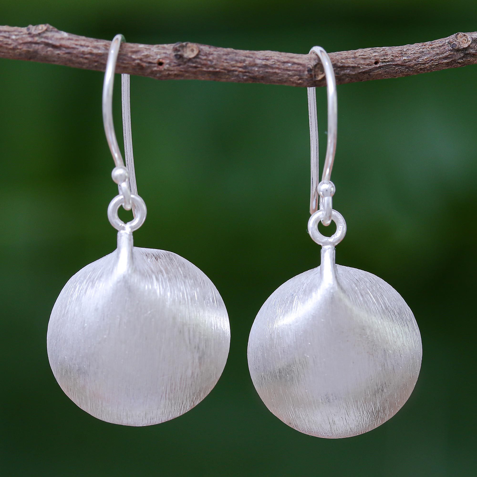 Brushed to a soft, satiny sheen, these 950 silver dangle earrings evoke full moons. The earrings are designed and crafted by Chanatip Na Lampoon in Thailand.